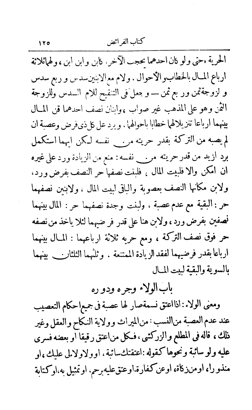 الحرية "حتى ولو كان أحدهما يحجب الآخر كابن وابن ابن ولهما ثلاثة أرباع المال بالخطاب والأحوال ولأم مع الابنين سدس وربع سدس ولزوجة ثمن وربع ثمن - وجعل في التنقيح للأم السدس وللزوجة الثمن وهو على المذهب غير صواب وابنان نصف أحدهما قن المال بينهما أرباعا تنزيلا لهما بأحوالهما ويرد على كل ذي فرض وعصبة أن لم يصبه من التركة بقدر حريته من نفسه لكن أيهما استكمل برد أزيد من قدر حريته من نفسه: منع من الزيادة ورد على غيره أن أمكن وإلا فلبيت المال فلبنت نصفها حر النصف بفرض ورد ولابن مكانها النصف بعصوبة والباقي لبيت المال ولابنين نصفهما حر: البقية مع عدم عصبة ولبنت وجدة نصفهما حر المال بينهما نصفين بفرض ورد ولابن هنا على قدر فرضيهما لئلا يأخذ من نصفه حر فوق نصف التركة ومع حرية ثلاثة أرباعهما المال بينهما أرباعا فرضيهما لفقد الزيادة الممتنعة وثلثهما الثلثان بينهما بالسوية والبقية لبيت المال.