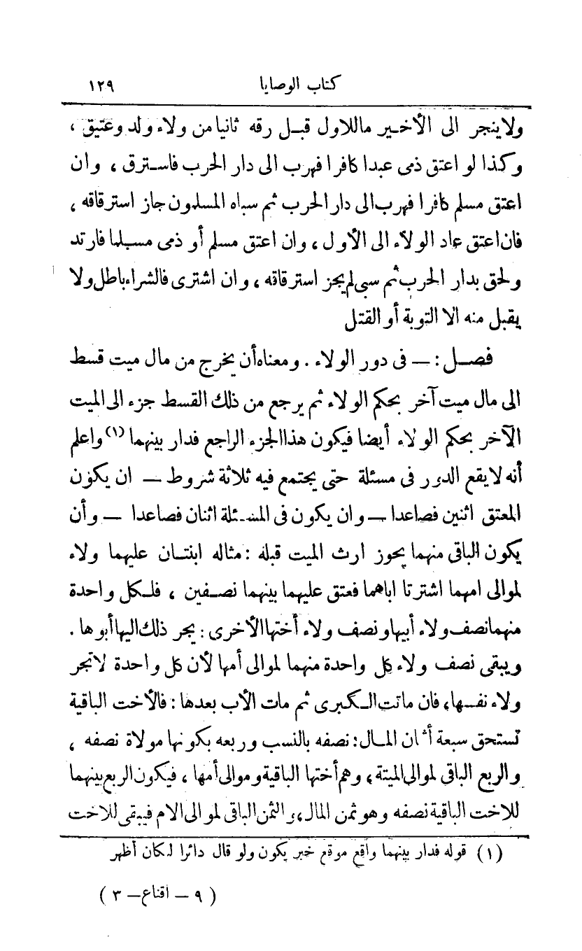 فصل: في دور الولاء ومعناه أن يخرج من مال ميت قسط إلى مال ميت آخر بحكم الولاء ثم يرجع من ذلك القسط جزء إلى الميت الآخر بحكم الولاء أيضا فيكون هذا الجزء الراجع فدار بينهما1 وأعلم أنه لا يقع الدور في مسألة حتى يجتمع فيه ثلاثة شروط - أن يكون المعتق اثنين فصاعدا - وأن يكون في المسألة اثنان فصاعدا - وأن يكون الباقي منهما يجوز أرث الميت قبله: مثاله ابنتان عليهما ولاء لموالي أمهما اشترتا أباهما فعتق عليهما بينهما نصفين فلكل واحدة منهما نصف ولاء أبيها ونصف ولاء أختها الكبرى: يجر ذلك إليها أبوها ويبقى نصف ولاء كل واحدة منهما لموالي أمها لأن كل واحدة لا تجر ولاء نفسها فأن ماتت الكبرى ثم مات الأب بعدها: فالأخت الباقية تستحق سبعة أثمان المال نصفه بالنسب وربعه بكونها مولاة نصفه والربع الباقي لموالى الميتة وهو أختها الباقية وموالي أمها فيكون الربع بينهما للأخت الباقية نصفه وهو ثمن المال والثمن الباقي لموالي الأم فيبقى للأخت