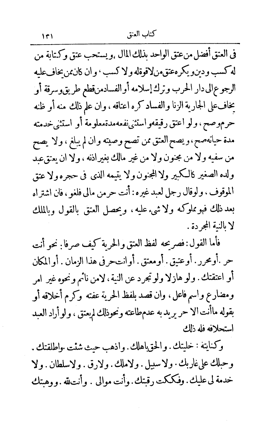 في العتق أفضل من عتق الواحد بذلك المال ويستحق عتق وكتابة من له كسب ودين ويكره عتق من لا قوة له ولا كسب وأن كان ممن يخاف عليه الرجوع إلى دار الحرب وترك إسلامه أو الفساد من قطع طريق وسرقة أو يخاف على الجارية الزنا والفساد كره إعتاقه وأن علم ذلك منه أو ظنه حرم وصح ولو اعتق رقيقه واستثنى نفعه مدة معلومة أو استثنى خدمته مدة حياته صح ويصح العتق ممن تصح وصيته وأن لم تبلغ ولا يصح من سفيه ولا من مجنون ولا من غير مالك بغير إذنه ولا أن يعتق عبد ولده الصغير كالكبير ولا المجنون ولا يتيمه الذي في حجره ولا عتق الموقوف ولو قال رجل لعبد غيره: أنت حر من مالي فلغو فأن اشتراه بعد ذلك فهو مملوكه ولا شيء عليه ويحصل العتق بالقول وبالملك لا بالنية المجردة.