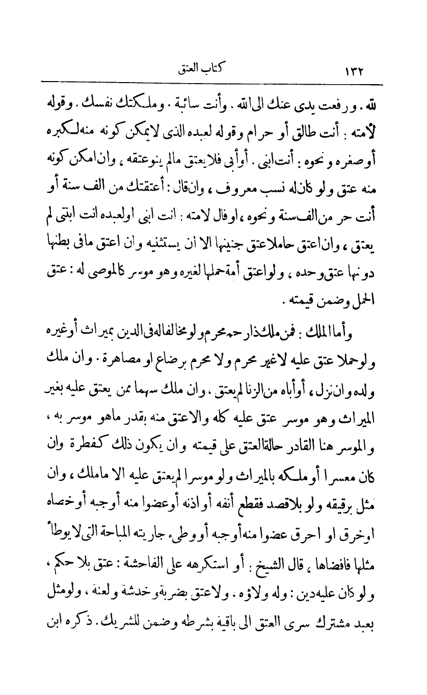 لله ورفعت يدي عنك إلى الله وأنت سائبة وملكتك نفسك وقوله لأمته أنت طالق أو حرام وقوله لعبده الذي لا يمكن كونه منه لكبره أو صغره ونحوه أنت ابني أو أبي فلا يعتق ما لم ينو عتقه أن أمكن كونه منه عتق ولو كان له نسب معروف وأن قال: أعتقتك من ألف سنة أو أنت حر من ألف سنة ونحوه أو قال لأمته: أنت ابني أو لعبده أنت ابنتي لم يعتق وأن اعتق حاملا عتق جنينها إلا أن يستثنيه وأن اعتق ما في بطنها دونها عتق وحده ولو اعتق أمة حملها لغيره وهو موسر كالموصي له عتق الحمل وضمن قيمته.