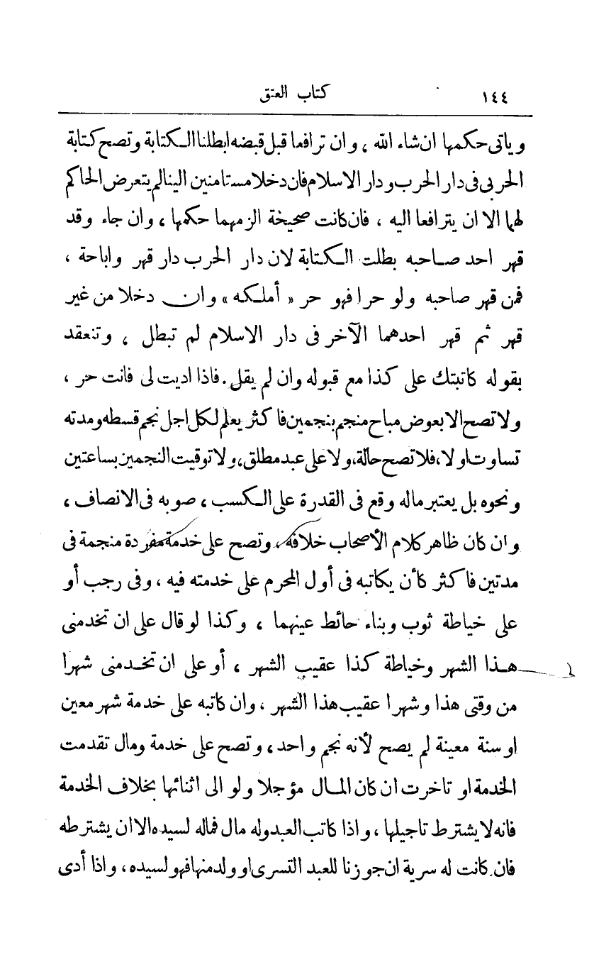 ويأتي حكمها أن شاء الله وأن ترافعا قبل قبضه أبطلنا الكتابة وتصح كتابة الحربي في دار الحرب ودار الإسلام فأن دخلا متسأمنين إلينا لم يتعرض الحاكم لهما إلا أن يترافعا إليه فأن كانت صحيحة ألزمها حكمها وأن جاء وقد قهر أحد صاحبه بطلت الكتابة لأن دار الحرب دار قهر وإباحة فمن قهر صاحبه ولو حرا فهو حر "أملكه" وأن دخلا من غير قهر ثم قهر أحدهما الآخر في دار الإسلام لم تبطل وتنعقد بقوله كاتبتك على كذا مع قبوله وأن لم يقل فإذا أديت لي فأنت حر ولا تصح إلا بعوض مباح منجم بنجمين فأكثر يعلم لكل أجل نجم قسطه ومدته تساوت أولا فلا تصح حالة ولا على عبد مطلق ولا توقيت النجمين بساعتين ونحوه بل يعتبر ماله وقع في القدرة على الكسب صوبه في الإنصاف وأن كان ظاهر كلام الأصحاب خلافه وتصح على خدمة مفردة منجمة في مدتين فأكثر كأن يكاتبه في أول المحرم على خدمته فيه وفي رجب أو خياطة ثوب وبناء حائط عينهما وكذا لو قال على أن تخدمني هذا الشهر وخياطة كذا عقيب الشهر أو على أن تخدمني شهر معين أو سنة معينة لم يصح لأنه نجم واحد وتصح على خدمة ومال تقدمت الخدمة أو تأخرت أن كان المال مؤجلا ولو إلى أثنائها بخلاف الخدمة فأنه لا يشترط تأجيلها وإذا كاتب العبد وله مال فماله لسيده إلا أن يشترطه فأن كانت له سرية أن جوزنا للعبد التسري أو ولد منها فهو لسيده وإذا أدى