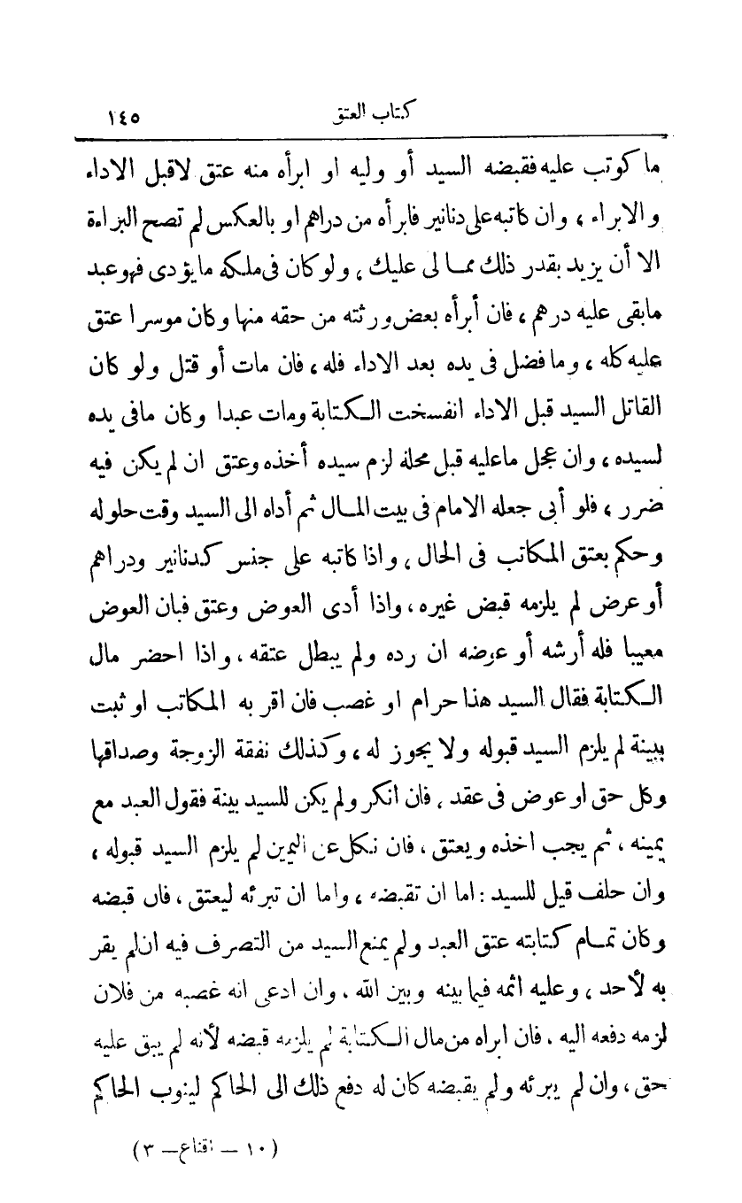ما كوتب عليه فقبضه السيد أو وليه أو أبرأه منه عتق لا قبل الأداء والإبراء وأن كاتبه على دنانير فأبرأه من دارهم أو بالعكس لم تصح البراءة إلا أن يزيد بقدر ذلك مما لي عليك ولو كان في ملكه ما يؤدي فهو عبد ما بقي عليه درهم فأن أبرأه بعض ورثته من حقه منها وكان موسرا عتق عليه كله وما فضل في يده بعد الأداء فله فأن مات أو قتل ولو كان القاتل السيد قبل الأداء انفسخت الكتابة ومات عبدا وكان ما في يده لسيده وأن عجل ما عليه قبل محله لزم سيده أخذه وعتق أن لم يكن فيه ضرر فلو أبى جعله الإمام في بيت المال ثم أداه إلى السيد وقت حلوله وحكم بعتق المكاتب في الحال وإذا كاتبه على جنس كدنانير ودراهم أو عرض لم يلزمه قبض غيره وإذا أدى العوض وعتق فبان العوض معيبا فله أرشه أو عوضه أن رده ولم يبطل عتقه وإذا احضر مال الكتابة فقال السيد هذا حرام أو غصب فأن أقر به المكاتب أو ثبت ببينة لم يلزم السيد قبوله ولا يجوز له وكذلك نفقة الزوجة وصداقها وكل حق أو عوض في عقد فأن أنكر ولم يكن للسيد بينة فقول العبد مع يمينه ثم يجب أخذه ويعتق فأن نكل عن اليمين لم يلزم السيد قبوله وأن حلف قيل للسيد: إما أن تقبضه وإما أن تبرئه ليعتق فأن قبضه وكان تمام كتابته عتق العبد ولم يمنع السيد من التصرف فيه أن لم يقر به لأحد وعليه أثمه فيما بينه وبين الله وأن أدعى أنه غصبه من فلان لزمه دفعه إليه فأن أبرأه من مال الكتابة لم يلزمه قبضه لأنه لم يبق عليه حق وأن لم يبرئه ولم يقبضه كان له دفع ذلك إلى الحاكم لينوب الحاكم
