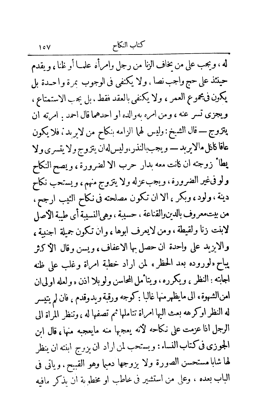 له ويجب على من يخاف الزنا من رجل وامرأة علما أو ظنا ويقدم حينئذ على حج واجب نصا ولا يكتفي في الوجوب بمرة واحدة بل يكون في مجموع العمر ولا يكتفي بالعقد فقط بل يجب الاستمتاع ويجزي تسر عنه ومن أمره به والده أو أحدهما قال أحمد أمرته أن يتزوج - قال الشيخ: وليس لهما إلزامه بنكاح من لا يريد فلا يكون عاقا كأكل ما لا يريد - ويجب بالنذر وليس له أن يتزوج ولا يتسرى ولا يطأ زوجته أن كانت معه بدار حرب إلا لضرورة ويصح النكاح ولو في غير الضرورة ويجب عزله ولا يتزوج منهم ويستحب نكاح دينة ولود وبكر وإلا أن تكون مصلحته في نكاح الثيب أرجح من بيت معروف بالدين والقناعة حسيبة وهي النسيبة أي طيبة الأصل لا بنت زنا ولقيطة ومن لا يعرف أبوها وأن تكون جميلة أجنبية ولا يزيد على واحدة أن حصل بها إلا عفاف ويسن وقال الأكثر يباح "لوروده بعد الحظر" لمن أراد خطبة امرأة وغلب على ظنه إجابته: النظر ويكرره ويتأمل المحاسن ولو بلا أذن "ولعله أولى أن أمن الشهوة" إلى ما يظهر منها غالبا: كوجه ورقبة ويد وقدم فأن لم يتيسر له النظر أو كرهه بعث إليها امرأة تتأملها ثم تصفها له وتنظر المرأة إلى الرجل إذا عزمت على نكاحه لأنه يعجبها منه ما يعجبه منها قال ابن الجوزي في كتاب النساء: ويستحب لمن أراد أن يزوج ابنته أن ينظر لها شابا مستحسن الصورة ولا يزوجها دميما وهو القبيح ويأتي في الباب بعده وعلى من استشير في خاطب أو مخطوبة أن يذكر ما فيه