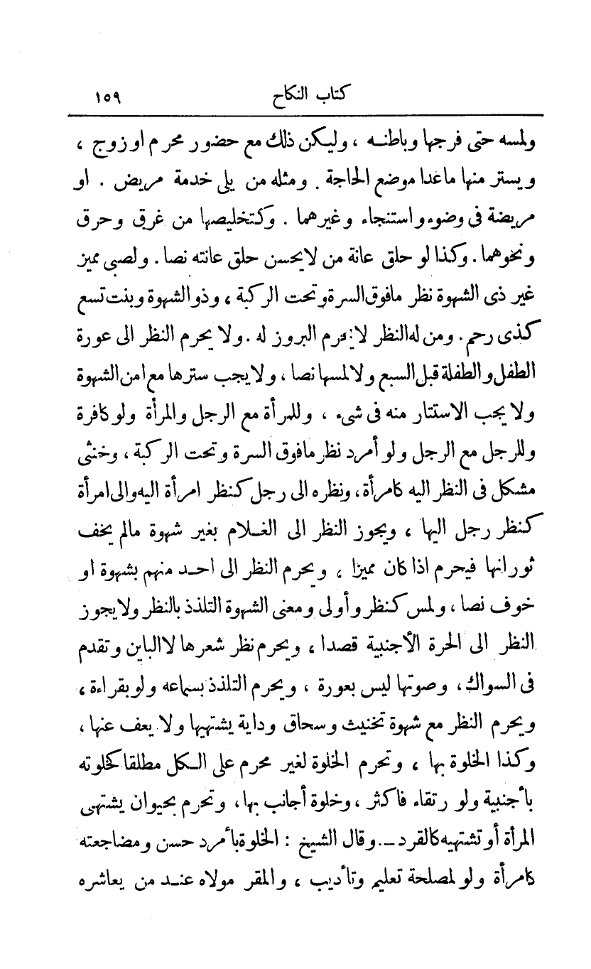 ولمسه حتى فرجها وباطنها ويكن ذلك مع حضور محرم أو زوج ويستتر منها ما عدا موضع الحاجة ومثله من يلي خدمة مريض أو مريضة في وضوء واستنجاء وغيرهما وكتخليصها من غرق وحرق ونحوهما وكذا لو حلق عانة من لا يحسن حلق عانته نصا ولصبي مميز غير ذي الشهوة ما فوق السرة وتحت الركبة وذو الشهوة وبنت تسع كذي رحم ومن له النظر لا يحرم البروز له ولا يحرم النظر إلى عورة الطفل والطفلة قبل السبع ولا لمسها نصا ولا يجب سترها مع أمن الشهوة ولا يجب الاستتار منه في شيء وللمرأة مع الرجل والمرأة ولو كافرة وللرجل مع الرجل ولو أمرد نظر ما فوق السرة وتحت الركبة وخنثي مشكل في النظر إليه كامرأة ونظره إلى رجل كنظر امرأة إليه وإلى امرأة كنظر رجل إليها ويجوز النظر إلى الغلام بغير شهوة ما لم يخف ثورانها فيحرم إذا كان مميزا ويحرم النظر إلى أحد منهم بشهوة أو خوف نصا ولمس كنظر وأولى ومعنى الشهوة التلذذ بالنظر ولا يجوز النظر إلى الحرة الأجنبية قصدا ويحرم نظر شعرها لا الباين وتقدم في السواك وصوتها ليس بعورة ويحرم التلذذ بسماعه ولو بقراءة ويحرم النظر مع شهوة تخنيث وسحاق وداية يشتهيها ولا يعف عنها وكذا الخلوة بها وتحرم الخلوة لغير محرم على الكل مطلقا كخلوته بأجنبية ولو رتقاء فأكثر وخلوة أجانب بها وتحرم بحيوان يشتهي المرأة وتشتهيه كالقرد - وقال الشيخ: الخلوة بأمرد حسن ومضاجعته كامرأة ولو لمصلحة تعليم وتأديب والمقر مولاه عند من يعاشره