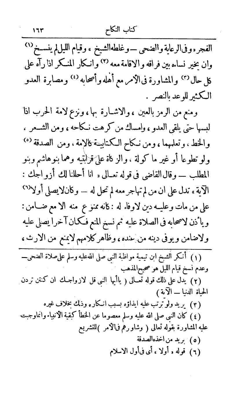 الفجر "وفي الرعاية والضحى - وغلطه الشيخ" وقيام الليل لم ينسخ1 وأن يخير نساءه بين فراقه والإقامة معه2 وإنكار المنكر إذا رآه على كال حال3 والمشاورة في الأمر مع أهله وأصحابه4 ومصابرة العدو الكثير للوعد بالنصر.