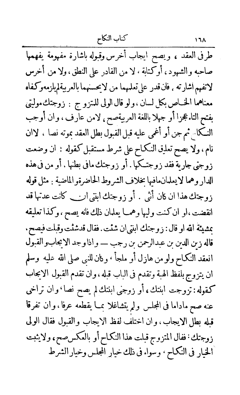 طرفي العقد ويصح إيجاب أخرس وقبوله بإشارة مفهومة يفهمها صاحبه والشهود أو كتابة لا من القادر على النطق ولا من أخرس لا تفهم إشارته فأن قدر على تعلمها من لا يحسنها بالعربية لم يلزمه وكفاه معناهما الخاص بكل لسان ولو قال الولي للمتزوج: زوجتك موليتي بفتح التاء عجزا أو جهلا باللغة العربية صح لا من عارف وأن أوجب النكاح ثم جن أو أغمى عليه قبل القبول بطل العقد بموته نصا لا أن نام ولا يصح تعليق النكاح على شرط مستقبل كقوله: أن وضعت زوجتي جارية فقد زوجتكها أو زوجتك ما في بطنها أو من في هذه الدار وهما لا يعلمان ما فيها بخلاف الشروط الحاضرة والماضية: مثل قوله زوجتك هذا أن كان أنثى أو زوجتك ابنتي أن كانت عدتها قد انقضت أو أن كنت وليها وهما يعلمان ذلك فأنه يصح وكذا تعليقه بمشيئة الله أو قال: زوجتك ابنتي أن شئت فقال قد شئت وقبلت فيصح قاله زين الدين بن عبد الرحمن بن رجب - وإذا وجد الإيجاب والقبول انعقد النكاح ولو من هازل أو ملجأ وكان النبي صلى الله عليه وسلم أن يتزوج بلفظ الهبة وتقدم في الباب قبله وأن تقدم القبول والإيجاب كقوله: تزوجت ابنتك أو زوجني ابنتك لم يصح نصا وأن تراخي عنه صح ما داما في المجلس ولم يتشاغلا بم يقطعه عرفا وأن تفرقا قبله بطل الإيجاب وأن اختلف لفظ الإيجاب والقبول فقال الولي زوجتك: فقال المتزوج قبلت هذا النكاح أو بالعكس صح ولا يثبت الخيار في النكاح وسواء في ذلك خيار المجلس وخيار الشرط.