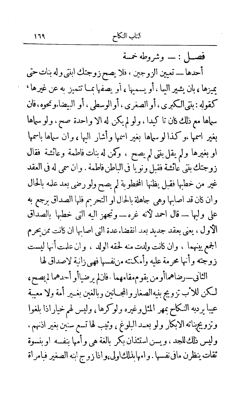 أحدها: تعيين الزوجين فلا يصح زوجتك ابنتي وله بنات حتى يميزها بأن يشير إليها أو يسميها أو يصفها بما تتميز به عن غيرها كقوله: بنتي الكبرى أو الصغرى أو الوسطى أو البيضاء ونحوه فأن سماها مع ذلك كان تأكيدا ولو لم يكن له إلا واحدة صح ولو سماها بغير اسمها وكذا لو سماها بغير اسماها وأشار إليها وأن سماها باسمها أو بغيرها ولم يقل بنتي لم يصح وكمن له بنات فاطمة وعائشة فقال زوجتك بنتي عائشة ونويا في الباطن فاطمة وأن سمى له في العقد غير من خطبه فقبل يظنها المخطوبة لم يصح ولو رضي بعد علمه بالحال وأن كان قد أصابها وهي جاهلة بالحال أو التحريم فلها الصداق يرجع به على وليها - قال أحمد لأنه غره - وتجهز إليه التي خطبها بالصداق الأول يعني بعقد جديد بعد انقضاء عدة التي أصابها أن كان ممن يحرم الجمع بينهما وأن كانت ولدت منه لحقه الولد وأن علمت أنها ليست زوجته وأنها محرمة عليه وأمكنته من نفسها فهي زانية لا صداق لها.
