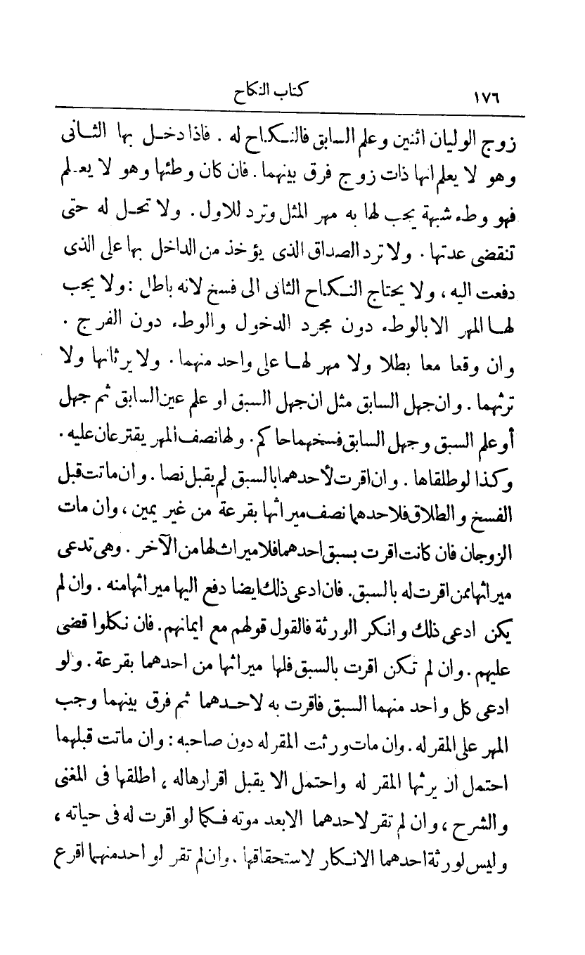 زوج الوليان اثنين وعلم السابق فالنكاح له فإذا دخل بها الثاني وهو لا يعلم أنها ذات فرق بينهما فأن كان وطئها وهو لا يعلم فهو وطء شبهة يجب لها به مهر المثل وترد للأول ولا تحل له حتى تنقضي عدتها ولا ترد الصداق الذي يؤخذ من الداخل بها على الذي دفعت إليه ولا يحتاج النكاح الثاني إلى فسخ لأنه باطل: ولا يجب لها المهر إلا بالوطء دون مجرد الدخول والوطء دون الفرج وأن وقعا معا بطلا ولا مهر لها على واحد منهما ولا يرثانها ولا ترثهما وأن جهل السابق مثل أن جهل السبق أو علم عين السابق ثم جهل أو علم السبق وجهل السابق فسخهما حاكم ولها نصف المهر يقترعان عليه وكذا لو طلقاها وأن أقرت لأحدهما بالسبق لم يقبل نصا وأن ماتت قبل الفسخ والطلاق فلأحدهما نصف ميراثها بقرعة من غير يمين وأن مات الزوجان فأن كانت أقرت بسبق أحدهما فلا ميراث لها من الآخر وهي تدعي ميراثها ممن أقرت له بالسبق فأن أدعى ذلك أيضا دفع إليها ميراثها منه وأن لم يكن أدعى ذلك وأنكر الورثة فالقول قولهم مع أيمانهم فأن نكلوا قضى عليهم وأن لم تكن أقرت بالسبق فلها ميراثها من أحدهما بقرعة ولو أدعى كل واحد منهما السبق فأقرت به لأحدهما ثم فرق بينهما وجب المهر على المقر له وأن مات ورثت المقر له دون صاحبه: وأن ماتت قبلهما أحتمل أن يرثها المقر له واحتمل إلا يقبل إقرارها له أطلقها في المغني والشرح وأن لم تقر لأحدهما إلا بعد موته فكما لو أقرت له في حياته وليس لورثة أحدهما الإنكار لاستحقاقها وأن لم تقر لواحد منهما أقرع