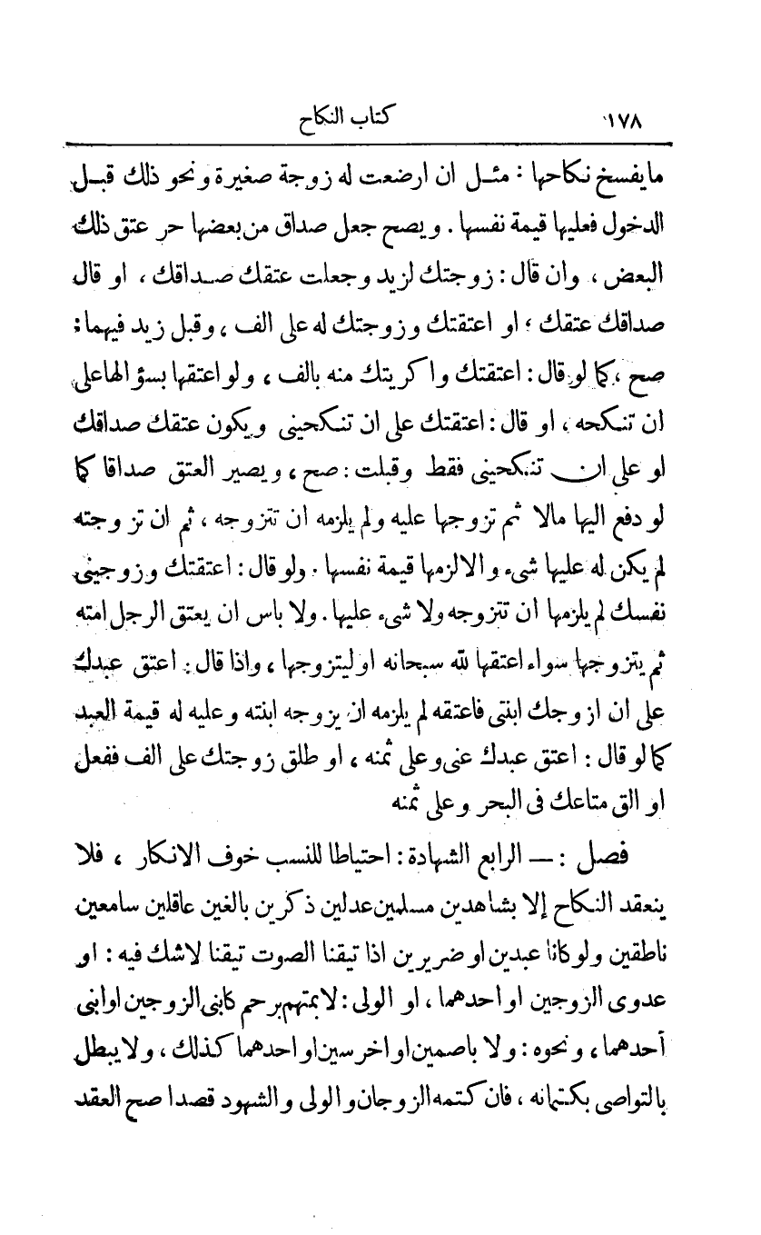 فصل: الرابع الشهادة: احتياطا للنسب خوف الإنكار فلا ينعقد النكاح إلا بشاهدين مسلمين عدلين ذكرين بالغين عاقلين سامعين ناطقين ولو كانا عبدين أو ضريرين إذا تيقنا الصوت تيقنا لا شك فيه: أو عدوى الزوجين أو أحدهما أو الولي: لا بمتهم برحم كابني الزوجين أو ابني أحدهما ونحوه: ولا بأصمين أو أخرسين أو أحدهما كذلك ولا يبطل بالتواصي بكتمانه فأن كتمه الزوجان والولي والشهود قصدا صح العقد