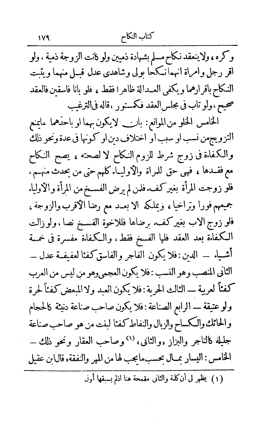 الخامس الخلو من الموانع: بأن لا يكون بهما أو بأحدهما ما يمنع التزويج من نسب أو سبب أو اختلاف دين أو كونها في عدة ونحو ذلك والكفاءة في زوج شرط للزوم النكاح لا لصحته يصح النكاح مع فقدها فهي حق للمرأة والأولياء كلهم حتى من يحدث منهم فلو زوجت المرأة بغير كفء فلمن لم يرض الفسخ من المرأة والأولياء جميعهم فورا وتراخيا ويملكه برضاها فللأخوة الفسخ نصا ولو زالت الكفاءة بعد العقد فلها الفسخ فقط والكفاءة مفسرة في خمسة أشياء - الدين: فلا يكون الفاجر والفاسق كفئا لعفيفة عدل - الثاني المنصب وهو النسب: فلا يكون العجمي وهو من ليس من العرب كفئا لعربية - الثالث الحرية: فلا يكون العبد ولا المبعض كفئا لحرة ولو عتيقة - الرابع الصناعة: فلا يكون صاحب صناعة دنيئة كالحجام والحائك والكساح والزبال والنفاط كفئا من هو صاحب صناعة جليلة كالتاجر والبزار "والثاني"1 وصاحب العقار ونحو ذلك.
