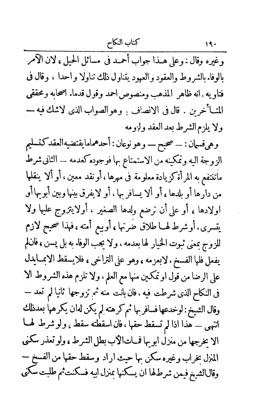 وهي قسمان: - صحيح - وهو نوعان: أحدهما ما يقتضيه العقد كتسليم الزوجة إليه وتمكينه من الاستمتاع بها فوجوده كعدمه - الثاني شرط ما تنتفع به المرأة كزيادة معلومة في مهرها أو نقد معين أو ألا ينقلها من دارها أو بلدها أو ألا يسافر بها أو لا يفرق بينها وبين أبويها أو أولادها أو على أن ترضع ولدها الصغير أو لا يتزوج عليها ولا يتسرى أو شرط لها طلاق ضرتها أو بيع أمته فهذا صحيح لازم للزوج بمعنى ثبوت الخيار لها بعدمه لا يجب الوفاء به بل يسن فإن لم يفعل فلها الفسخ لا بعزمه وهو على التراخي فلا يسقط إلا بمال يدل على الرضا من قول أو تمكين منها مع العلم ولا تلزم هذه الشروط إلا في النكاح الذي شرطت فيه فإن بانت منه ثم تزوجها ثانيا لم تعد - وقال الشيخ: لو خدعها فسافر بها ثم كرهته لم يكن له أن يكرهها بعد ذلك انتهى - هذا إذا لم تسقط حقها فإن أسقطته سقط ولو شرطا سكنى المنزل بخراب وغيره سكن بها حيث أراد وسقط حقها من الفسخ - وقال الشيخ فيمن شرطا لها أن يسكنها بمنزل أبيه فسكنت ثم طلبت سكنى