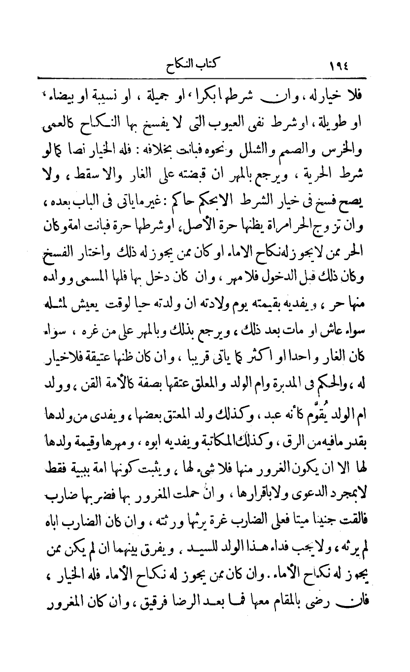 فلا خيار له وإن شرطها بكرا أو جميلة أو نسيبة أو بيضاء أو طويلة أو شرط نفي العيوب التي لا يفسخ بها النكاح كالعمى والخرس والصم والشلل ونحوه فبانت بخلافه: فله الخيار نصا كما لو شرط الحرية ويرجع بالمهر أن قبضته على الغار وإلا سقط ولا يصح فسخ في خيار الشرط إلا بحكم حاكم غير ما يأتي في الباب بعده وأن تزوج الحر امرأة يظنها حرة الأصل أو شرطها حرة فبانت أمة وكان الحر ممن لا يجوز له نكاح الأماء أو كان ممن يجوز له ذلك وأختار الفسخ وكان ذلك قبل الدخول فلا مهر وأن كان دخل بها فلها المسمى وولده منها حر ويفديه بقيمته يوم ولادته حيا لوقت يعيش لمثله سواء عاش أو مات بعد ذلك ويرجع بذلك وبالمهر على من غره سواء كان الغار واحدا أو أكثر كما يأتي قريبا وأن كان ظنها عتيقة فلا خيار له والحكم في المدبرة وأم الولد والمعلق عتقها بصفة كالأمة القن وولد أم الولد يقوم كأنه عبد وكذلك ولد المعتق بعضها ويفدي من ولدها بقدر ما فيه من الرق وكذلك المكاتبة ويفديه أبوه ومهرها وقيمة ولدها لها إلا أن يكون الغرور منها فلا شيء لها ويثبت كونها ببينة فقط لا بمجرد الدعوى ولا بإقرارها وأن حملت المغرور بها فضربها ضارب فألقت جنينا ميتا فعلى الضارب غرة يرثها ورثته وأن كان الضارب أباه لم يرثه ولا يجب فداء هذا الولد للسيد ويفرق بينهما أن لم يكن ممن يجوز له نكاح الأماء وإن كان ممن يجوز له نكاح الأماء فله الخيار فإن رضي بالمقام معها فما بعد الرضا فرقيق وأن كان المغرور