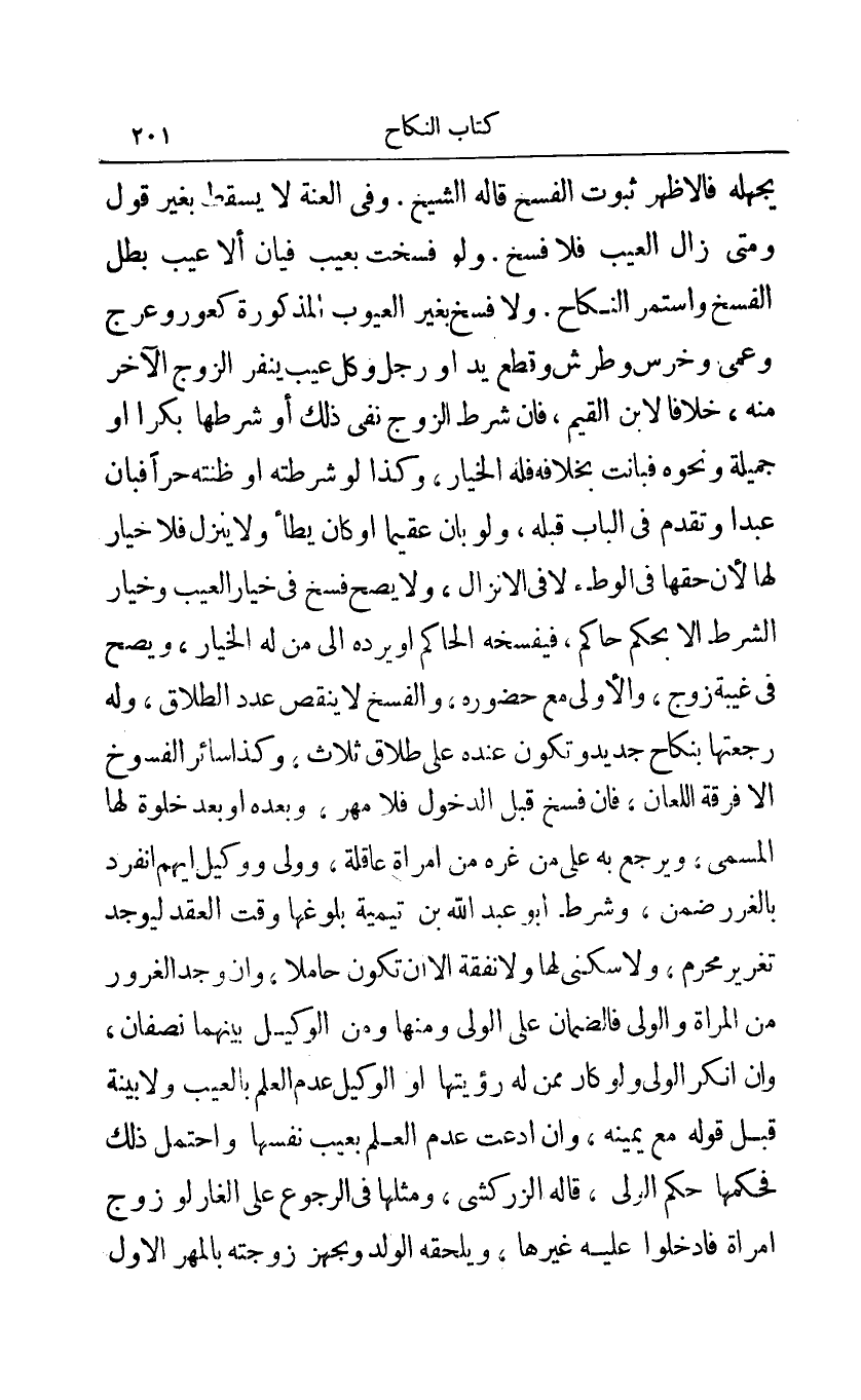 يجهله فالأظهر ثبوت الفسخ قاله الشيخ وفي العنة لا يسقط بغير قول ومتى زال العيب فلا فسخ ولو فسخت بعيب فبان إلا عيب بطل الفسخ واستمر النكاح ولا فسخ بغير العيوب المذكورة كعور وعرج وعمى وخرس وطرش وقطع يد أو رجل وكل عيب ينفر الزوج الآخر منه خلافا ل ابن القيم فإن شرط الزوج نفى ذلك أو شرطها بكرا أو جميلة ونحوه فبانت بخلافه فله الخيار وكذا لو شرطته أو ظنته حرا فبان عبدا وتقدم في الباب قبله ولو بان عقيما أو كان يطأ ولا ينزل فلا خيار لها لأن حقها في الوطء لا في الإنزال ولا يصح فسخ في خيار العيب وخيار الشرط إلا بحكم حاكم فيفسخه الحاكم أو يرده إلى من له الخيار ويصح في غيبة زوج والأولى مع حضوره والفسخ لا ينقص عدد الطلاق وله رجعتها بنكاح جديد وتكون عنده على طلاق ثلاث وكذا سائر الفسوخ إلا فرقة اللعان فإن فسخ قبل الدخول فلا مهر وبعده أو بعد خلوة لها المسمى ويرجع به على من غره من امرأة عاقلة وولي ووكيل أيهم أنفرد بالغرر ضمن وشرط أبو عبد الله بن تيمية بلوغها وقت العقد ليوجد تغرير محرم ولا سكنى لها ولا نفقة إلا أن تكون حاملا وأن وجد الغرور من المرأة والولي فالضمان على الولي ومنها ومن الوكيل بينهما نصفان وأن أنكر الولي لو كان ممن له رؤيتها أو الوكيل عدم العلم بالعيب ولا بينة قبل قوله مع يمينه وإن ادعت عدم العلم بعيب نفسها واحتمل ذلك فحكمها حكم الولي قاله الزركشي ومثلها في الرجوع على الغار لو زوج امرأة فادخلوا عيه غيرها ويلحقه الولد ويجهز زوجته بالمهر الأول