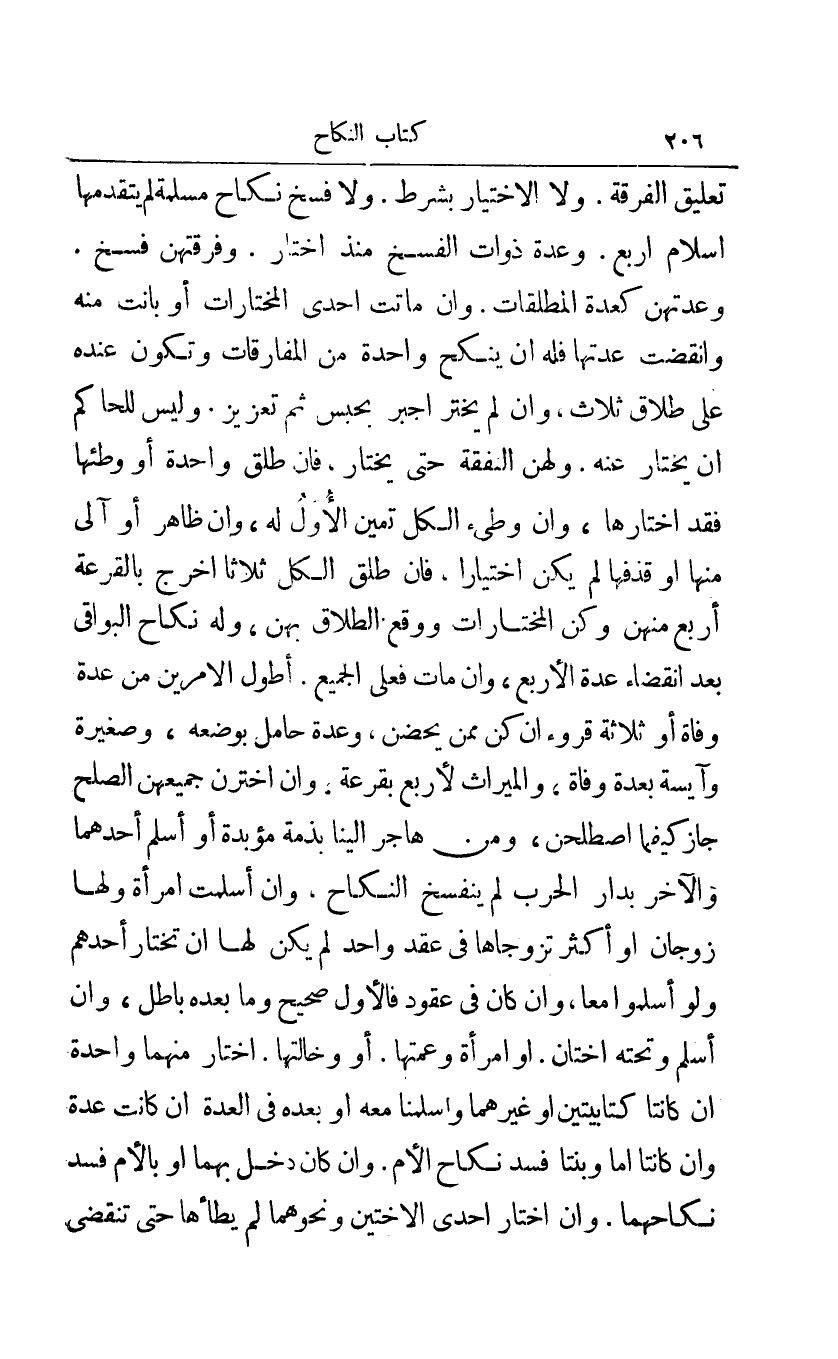 تعليق الفرقة ولا الاختيار بشرط ولا فسخ نكاح مسلمة لم يتقدمها إسلام أربع وعدة ذوات الفسخ منذ اختار وفرقتهن فسخ وعدتهن كعدة المطلقات وأن ماتت إحدى المختارات أو بانت منه وانقضت عدتها فله أن ينكح واحدة من المفارقات وتكون عنده على طلاق ثلاث وإن لم يختر أجبر بحبس ثم تعزير وليس للحاكم أن يختار عنه ولهن النفقة حتى يختار فإن طلق واحدة أو وطئها فقد أختارها وأن وطئ الكل تعين الأول له وأن ظاهر أو آلى منها أو قذفها لم يكن اختيارا فإن طلق الكل ثلاثا أخرج بالقرعة أربع منهن وكن المختارات ووقع الطلاق بهن وله نكاح البواقي بعد انقضاء عدة الأربع وإن مات فعلى الجميع أطول الأمرين من عدة وفاة أو ثلاثة قروء إن كن ممن يحضن وعدة حامل بوضعه وصغيرة وآيسة بعد وفاة والميراث لأربع بقرعة وإن اخترن جميعهن الصلح جاز كيفما اصطلحن ومن هاجر إلينا بذمة مؤبدة أو أسلم أحدهما والآخر بدار الحرب لم ينفسخ النكاح وإن أسلمت امرأة ولها زوجان أو أكثر تزوجاها في عقد واحد لم يكن لها أن تختار أحدهم ولو أسلموا معا وإن كان في عقود فالأول صحيح وما بعده باطل وإن أسلم وتحته أختان أو امرأة وعمتها أو خالتها اختار منهما واحدة إن كانتا كتابيتين أو غيرهما وأسلمنا معه أو بعده في العدة إن كانت عدة وإن كانتا إما وبنتا فسد نكاح الأم وإن كان دخل بهما أو بالأم فسد نكاحهما وإن أختار أحد الأختين ونحوهما لم يطأها حتى تنقضي