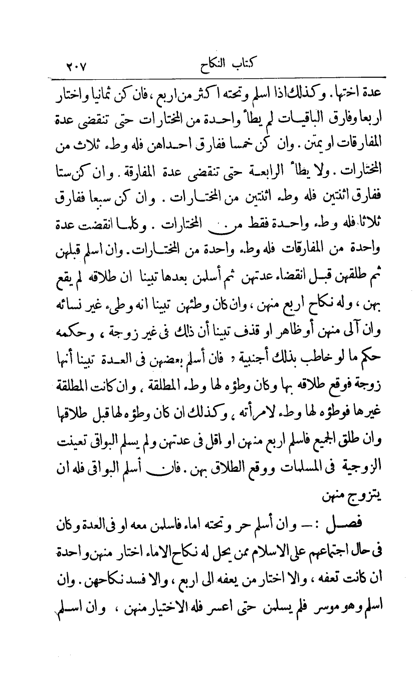 عدة أختها وكذلك إذا أسلم وتحته أكثر من أربع فإن كن ثمانيا وأختار أربعا وفارق الباقيات لم يطأ واحدة من المختارات حتى تنقضي عدة المفارقات أو يمتن وإن كن خمسا ففارق إحداهن فله وطء ثلاث من المختارات ولا يطأ الرابعة حتى تنقضي عدة المفارقة وإن كن ستا ففارق اثنتين فله وطء اثنتين من المختارات وأن كن سبعا ففارق ثلاثا فله وطء واحدة فقط من المختارات وكلما انقضت عدة واحدة من المفارقات فله وطء واحدة من المختارات وإن أسلم قبلهن ثم طلقهن قبل انقضاء عدتهن ثم أسلمن بعدها تبينا إن طلاقه لم يقع بهن وله نكاح أربع منهن وإن كان وطئهن تبينا أنه وطئ غير نسائه وأن آلى منهن أو ظاهر أو قذف تبينا أن ذلك في غير زوجة وحكمه حكم ما لو خاطب بذلك أجنبية فإن أسلم بعضهن في العدة تبينا أنها زوجة فوقع طلاقه بها وكان وطؤه لها وطئ المطلقة وإن كانت المطلقة غيرها فوطؤها لها وطء لامرأته كذلك إن كان وطؤه لها قبل طلاقها وإن طلق الجميع فأسلم أربع منهن أو بأقل في عدتهن ولم يسلم البواقي تعينت الزوجية في المسلمات ووقع الطلاق بهن فإن أسلم البواقي فله إن يتزوج منهن.