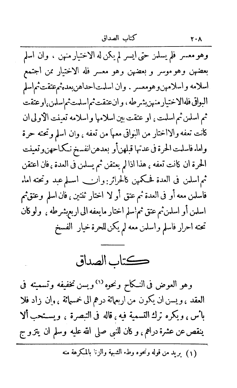 وهو العوض في النكاح ونحوه1 ويسن تخفيفه وتسميته في العقد ويسن أن يكون من أربعمائة درهم إلى خمسمائة وإن زاد فلا بأس ويكره ترك التسمية فيه قاله في التبصرة ويستحب ألا ينقص عن عشرة دراهم وكان النبي صلى الله عليه وسلم أن يتزوج