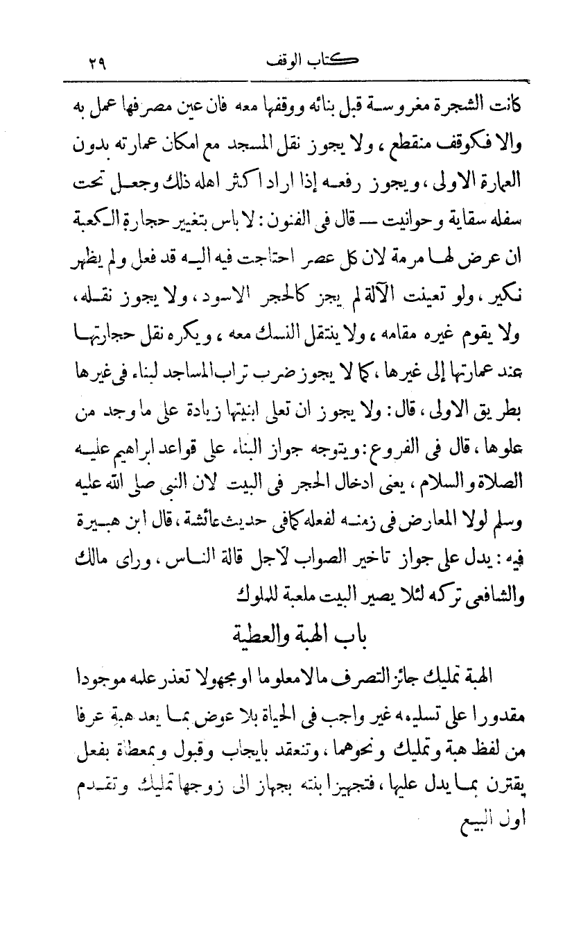 كانت الشجرة مغروسة قبل بنائه ووقفها معه فأن عين مصرفها عمل به وإلا فكوقف منقطع ولا يجوز نقل المسجد مع إمكان عمارته بدون العمارة الأولى ويجوز رفعه إذا أراد أكثر أهله ذلك وجعل تحت سفله سقاية وحوانيت - قال في الفنون: لا بأس بتغيير حجارة الكعبة أن عرض لها مرمة لأن كل عصر احتاجت فيه إليه قد فعل ولم يظهر نكير ولو تعينت الآلة لم يجز كالحجر الأسود ولا يجوز نقله ولا يقوم غيره مقامه ولا ينتقل النسك معه ويكره نقل حجارتها عند عمارتها إلى غيرها كما لا يجوز ضرب تراب المساجد لبناء في غيره بطريق الأولى قال: ولا يجوز أن تعلى أبنيتها زيادة على ما وجد من علوها قال في الفروع: ويتوجه جواز البناء على قواعد عليه الصلاة والسلام يعني إدخال الحجر في البيت لأن النبي صلى الله عليه وسلم لولا المعارض في زمنه لفعله كما في حديث عائشة قال ابن هبيرة فيه: يدل على جواز تأخير الصواب لأجل قالة الناس ورأى مالك والشافعي تركه لئلا يصير البيت ملعبة للملوك.