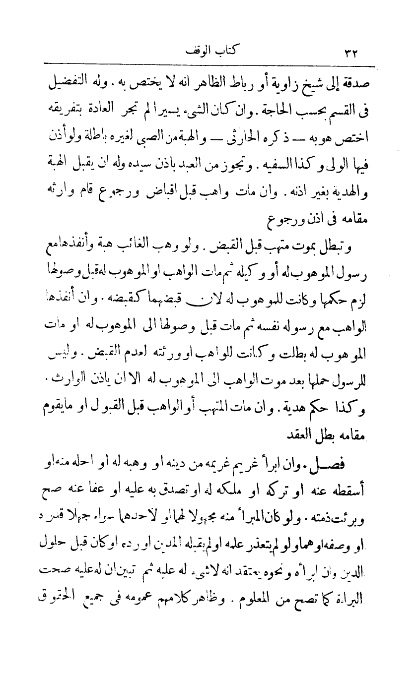 صدقة إلى شيخ زاوية أو رباط الظاهر أنه لا يختص به وله التفضيل في القسم بحسب الحاجة وأن كان الشيء يسيرا لم تجر العادة بتفريقه اختص هوبه - ذكره الحارثي - والهبة من الصبي لغيره باطلة ولو إذن فيها الولي وكذا السفيه وتجوز من العبد بإذن سيده وله أن يقبل الهبة والهدية بغير إذنه وأن مات واهب قبل إقباض ورجوع قام وارثه مقامه في إذن ورجوع