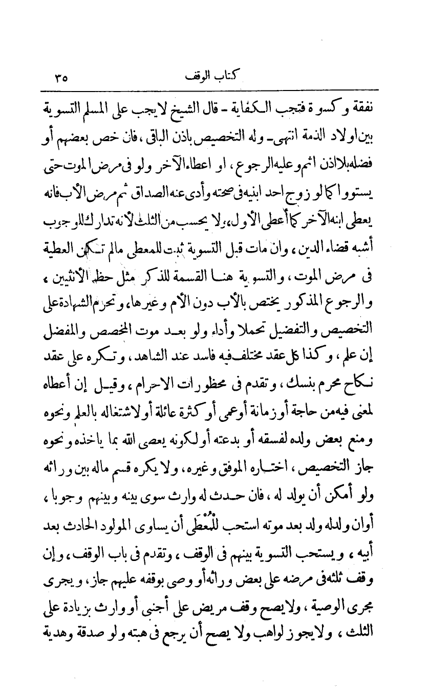 نفقة وكسوة فتجب النفقة - قال الشيخ لا يجب على المسلم التسوية بين أولاد الذمة انتهى - وله التخصيص بإذن الباقي فأن خص بعضهم أو فضله بلا إذن إثم وعليه الرجوع أو إعطاء الآخر ولو في مرض الموت حتى يستووا كما لو زوج أحد ابنيه في صحته وأدى عنه الصداق ثم مرض الأب فأنه يعطي ابنه الآخر كما أعطى الأول ولا يحسب من الثلث لأنه تدارك للوجوب أشبه قضاء الدين وأن مات قبل التسوية ثبت للمعطي ما لم تكن العطية في مرض الموت والتسوية هنا القسمة للذكر مثل حظ الأنثيين والرجوع المذكور يختص بالأب دون الأم وغيرها وتحرم الشهادة على التخصيص والتفضيل تحملا وأداء ولو بعد موت المخصص والمفضل إن علم وكذا كل عقد مختلف فيه فاسد عند الشاهد وتكره على عقد نكاح محرم بنسك وتقدم في محظورات الإحرام وقيل إن أعطاه لمعنى فيه من حاجة أو زمانه أو أعمى أو كثرة عائلة أو لاشتغاله بالعلم ونحوه ومنع بعض ولده لفسقه أو بدعته أو لكونه يعصي الله بما يأخذه ونحوه جاز التخصيص أختاره الموفق وغيره ولا يكره قسم ماله بين وراثه ولو أمكن أن يولد له فأن حدث له وارث سوى بينه وبينهم وجوبا أو أن ولد له ولد بعد موته استحب للمعطي أن يساوي المولود الحادث بعد أبيه ويستحب التسوية بينهم في الوقف وتقدم في باب الوقف وإن وقف ثلثه في مرضه على بعض وارثه أو وصى بوقفه عليهم جاز ويجري مجرى الوصية ولا يصح وقف مريض على أجنبي أو وارث بزيادة على الثلث ولا يجوز لواهب ولا يصح أن يرجع في هبته ولو صدقه وهدية