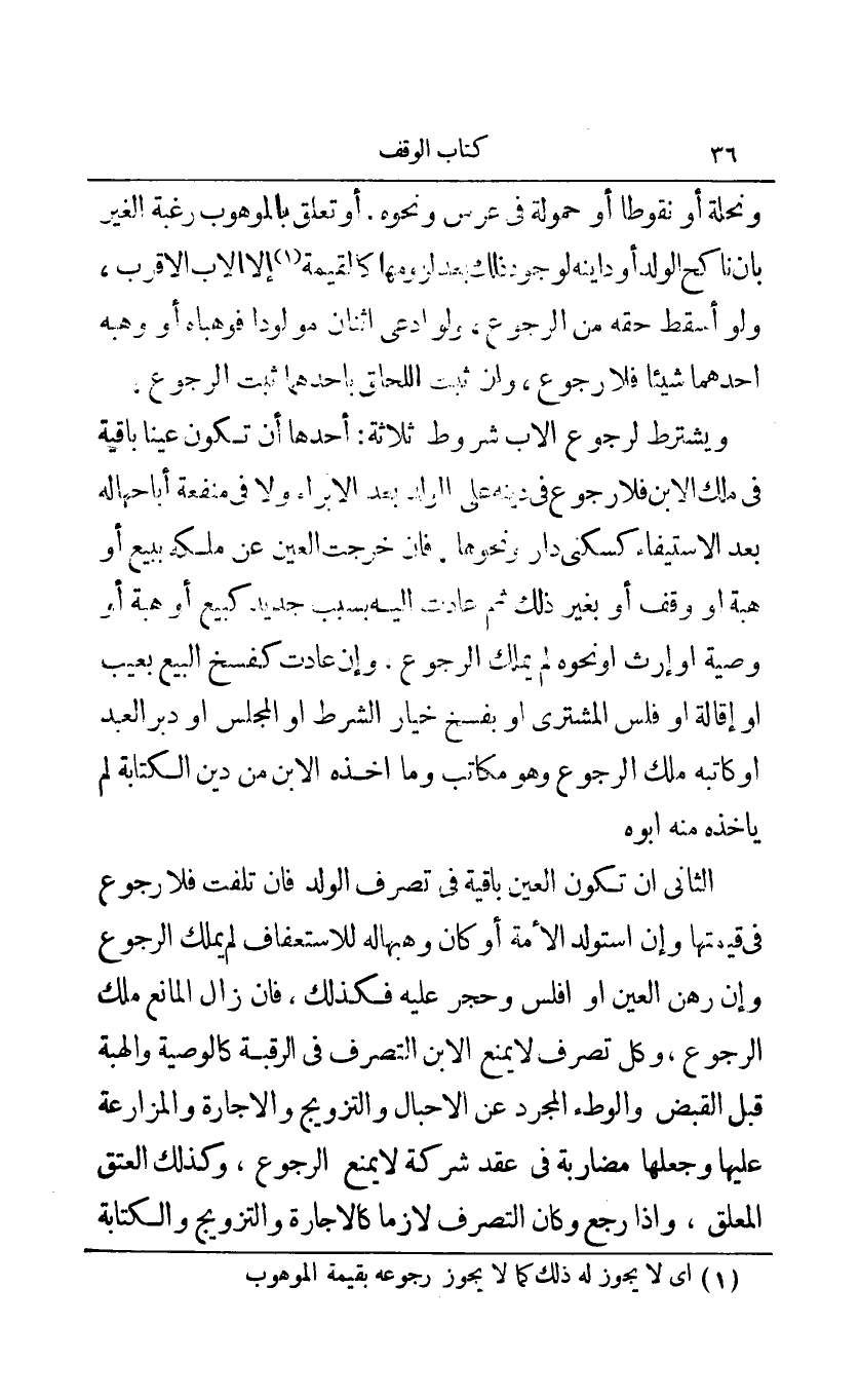 الثاني: أن تكون العين باقية في تصرف الولد فأن تلفت فلا رجوع في قيمتها وإن استولد الأمة أو كان وهبها له للاستعفاف لم يملك الرجوع وإن رهن العين أو أفلس وحجر عليه فكذلك فأن زال المانع ملك الرجوع وكل تصرف لا يمنع الابن التصرف في الرقبة كالوصيلة والهبة قبل القبض والوطء المجرد عن الإحبال والتزويج والإجارة والمزارعة عليها وجعلها مضاربة في عقد شركة لا يمنع الرجوع وكذلك العتق المعلق وإذا رجع وكان التصرف لازما كالإجارة والتزويج والكتابة