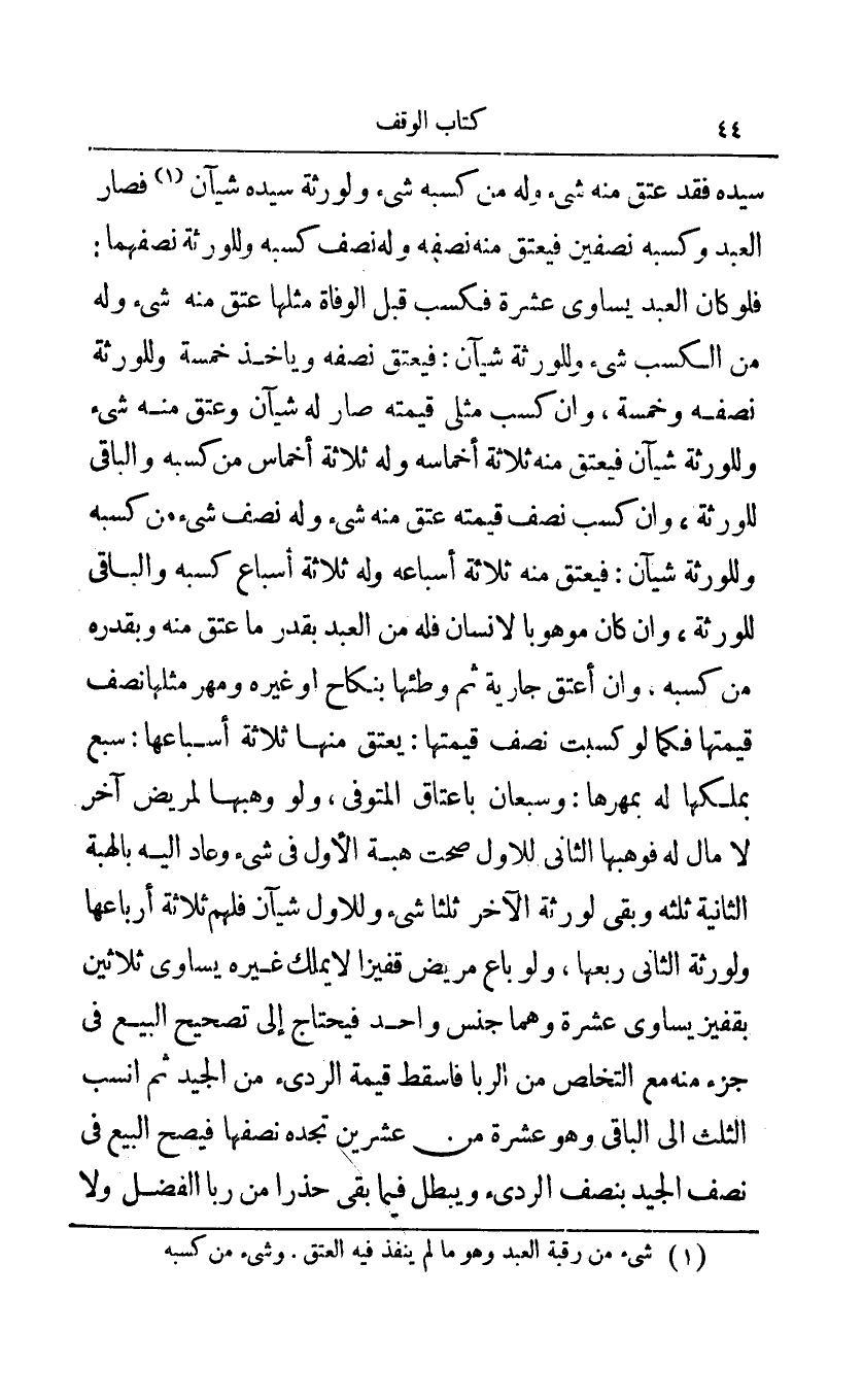 سيده فقد عتق منه شيء وله من كسبه شيء ولورثة سيده شيآن1 فصار العبد وكسبه نصفين فيعتق منه نصفه وله نصف كسبه وللورثة نصفهما: فلو كان العبد يساوي عشرة فكسب قبل الوفاة مثلها عتق منه شيء وله من الكب شيء وللورثة شيآن: فيعتق نصفه ويأخذ خمسة وللورثة نصفه وخمسة وأن كسب مثلي قيمته صار له شيآن وعتق منه شيء وللورثة شيآن فيعتق منه ثلاثة أخماسه وله ثلاثة أخماس من كسبه والباقي للورثة وأن كسب نصف قيمته عتق منه شيء وله نصف شيء من كسبه وللورثة شيآن: فيعتق منه ثلاثة أسباعه وله ثلاثة أسباع كسبه والباقي للورثة وأن كان موهوبا لإنسان فله من العبد بقدر ما عتق منه وبقدره من كسبه وأن أعتق جارية ثم وطئها بنكاح أو غيره ومهر مثلها نصف قيمتها فكما لو كسبت نصف قيمتها: يعتق منها ثلاثة أسباعها: سبع بملكها له بمهرها: وسبعان بإعتاق المتوفى ولو وهبها لمريض آخر لا مال له فوهبها الثاني للأول صحت هبة الأول في شيء وعاد إليه بالهبة الثانية ثلثه وبقي لورثة الآخر ثلثا شيء وللأول شيآن فلهم ثلاثة أرباعها ولورثة الثاني ربعها ولو باع مريض قفيزا لا يملك غيره يساوي ثلاثين بقفيز يساوي عشرة وهما جنس واحد فيحتاج إلى تصحيح البيع في جزء منه مع التخلص من الربا فأسقط قيمة الرديء من الجيد ثم أنسب الثلث إلى الباقي وهو عشرة من عشرين تجده نصفها فيصح البيع في نصف الجيد بنصف الرديء ويبطل فيما بقي حذرا من ربا الفضل ولا