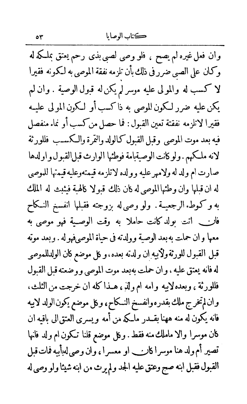وأن فعل غيره لم يصح فلو وصى لصبي بذي رحم يعتق بملكه له وكان على الصبي ضرر في ذلك بأن تلزمه نفقة الموصي به لكونه فقيرا لا كسب له والمولي عليه موسر لم يكن له قبول الوصية وأن لم يكن عليه ضرر لكون الموصي به ذا كسب أو لكون المولي عليه فقيرا لا تلزمه نفقته تعين القبول: فما حصل من كسب أو نماء منفصل فيه بعد موت الموصي وقبل القبول كالولد والتمرة والكسب فللورثة لأنه ملكهم ولو كانت الوصية بأمة فوطئها الوارث قبل القبول وأولدها صارت أم ولد له ولا مهر عليه وولده لا تلزمه قيمته وعليه قيمتها للموصي له أن قبلها وأن وطئها الموصى له كان ذلك قبولا كالهبة فيثبت له الملك به وكوطء الرجعية ولو وصى له بزوجته فقبلها انفسخ النكاح فان أتت بولد كانت حاملا به وقت الوصية فهو موصى به معها وأن حملت به بعد الوصية وولدته في حياة الموصي فهو له وبعد موته قبل القبول للورثة ولأبيه أن ولدته بعده وكل موضع كان الولد للموصي له فأنه يعتق عليه وأن حملت به بعد موت الموصي ووضعته قبل القبول فللورثة وبعده لأبيه وأمه أم ولد هذا كله أن خرجت من الثلث وأن لم تخرج ملك بقدره وانفسخ النكاح وكل موضع يكون الولد لأبيه فأنه يكون له منه ههنا بقدر ملكه من أمه ويسري العتق إلى باقيه أن كان موسرا وإلا ما ملك منه فقط وكل موضع قلنا تكون أم ولد فإنها تصير أم ولد هنا موسرا كان أو معسرا وأن وصى له أبيه فمات قبل القبول فقبل ابنه صح وعتق عليه الجد ولم يرث من ابنه شيئا ولو وصى له