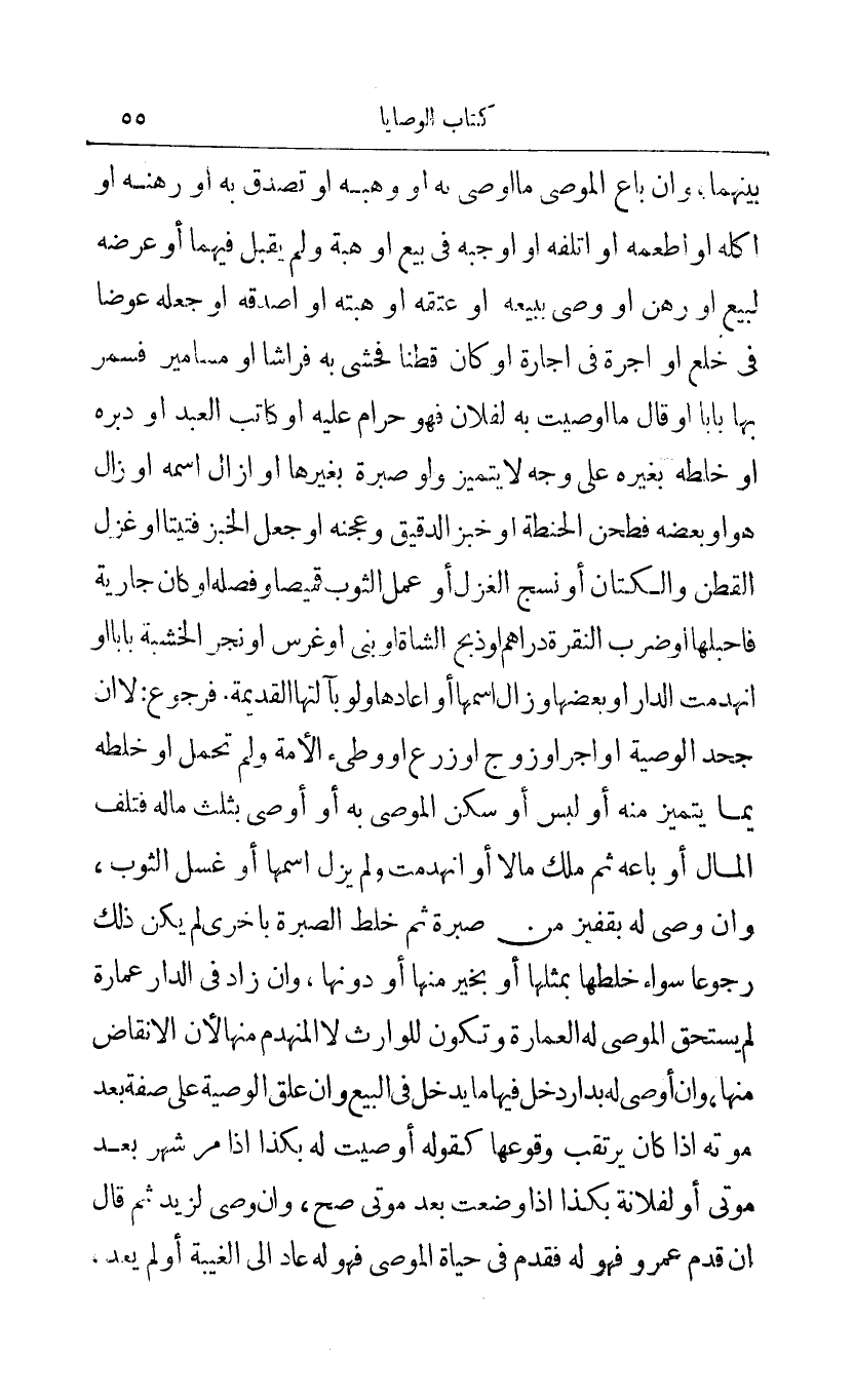 بينهما وأن باع الموصي ما أوصى به أو وهبه أو تصدق به أو رهنه أو أكله وأطعمه أو أتلفه أو أوجبه في بيع أو هبة ولم يقبل فيهما أو عرضه لبيع أو رهن أو وصى ببيعه أو عتقه أو هبته أو أصدقه أو جعله عوضا في خلع أو أجرة في إجارة أو كان قطنا فخشى به فراشا أو مسامير فسمر بها بابا أو قال ما أوصيت به لفلان حرام عليه أو كاتب العبد أو دبره أو خلطه بغيره على وجه لا يتميز ولو صبرة بغيرها أو أزال اسمه أو زال هو أو بعضه فطحن الحنطة أو خبز الدقيق وعجنه أو جعل الخبز فتيتا أو غزل القطن والكتان أو نسج الغزل أو عمل الثوب قميصا وفصله أو كان جارية فأحبلها أو ضرب النقرة دراهم أو ذبح الشاة أو بنى أو غرس أو نجر الخشبة بابا أو انهدمت الدار أو بعضها وزال اسمها أو أعادها ولو بآلتها القديمة: فرجوع: لا أن جحد الوصية أو أجر أو زوج أو زرع أو وطئ الأمة ولم تحمل أو خلطه بما يتميز منه أو لبس أو سكن الموصي به أو أوصى بثلث ماله فتلف المال أو باعه ثم ملك مالا أو انهدمت ولم يزل اسمها أو غسل الثوب وأن وصى له بقفيز من صبرة ثم خلط الصبرة بأخرى لم يكن ذلك رجوعا سواء خلطها بمثلها أو بخير منها أو دونها وأن زاد في الدار عمارة لم يستحق الموصى له العمارة وتكون للوارث لا المنهدم منها لأن الأنقاض منها وأن أوصى له بدار دخل فيها ما يدخل في البيع وأن علق الوصية على صفة بعد موته إذا كان يرتقب وقوعها كقوله أوصيت له بكذا إذا مر شهر بعد موتي أو لفلانة بكذا إذا وضعت بعد موتي صح وأن وصى لزيد ثم قال أن قدم عمرو فهو له فقدم في حياة الموصي فهو له عاد إلى الغيبة أو لم يعد
