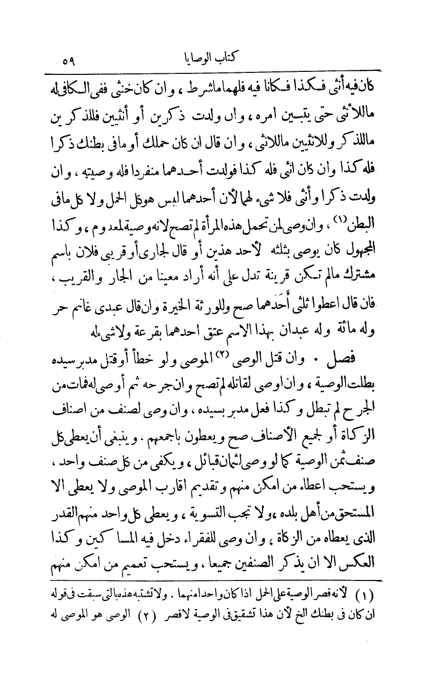 كان فيه أنثى فكذا فكانا فيه فلهما ما شرط وأن كان خنثى ففي الكافي له ما للأنثى حتى يتبين أمره وأن ولدت ذكرين أو أنثيين فللذكرين ما للذكر وللأنثيين ما للأنثى وأن قال أن كان حملك أو ما في بطنك ذكرا فله كذا وأن كان أنثى فله كذا فولدت أحدهما منفردا فله وصيته وأن ولدت ذكرا وأنثى فلا شيء لهما لأن أحدهما ليس هو كل الحمل ولا كل ما في البطن1 وأن وصى لمن تحمل هذه المرأة لم تصح لأنه وصية لمعدوم وكذا المجهول كان يوصي بثلثه لأحد هذين أو قال لجاري أو قريبي فلان باسم مشترك ما لم تكن قرينة تدل على أنه أراد معينا من الجار والقريب فأن قال أعطوا أحدهما صح وللورثة الخيرة وأن قال عبدي غانم حر وله مائة وله عبدان بهذا الاسم عتق أحدهما بقرعة ولا شيء له.
