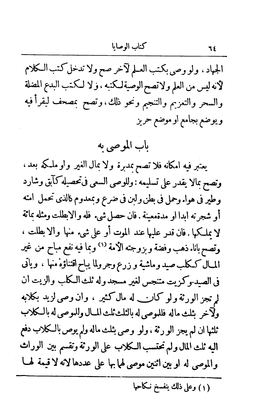 الجهاد ولو وصى بكتب العلم لآخر صح ولا تدخل كتب الكلام لأنه ليس من العلم ولا تصح لكتبه ولا لكتب البدع المضلة والسحر والتعزيم والتنجيم ونحو ذلك وتصح بمصحف ليقرأ فيه ويوضع بجامع أو موضع حريز.