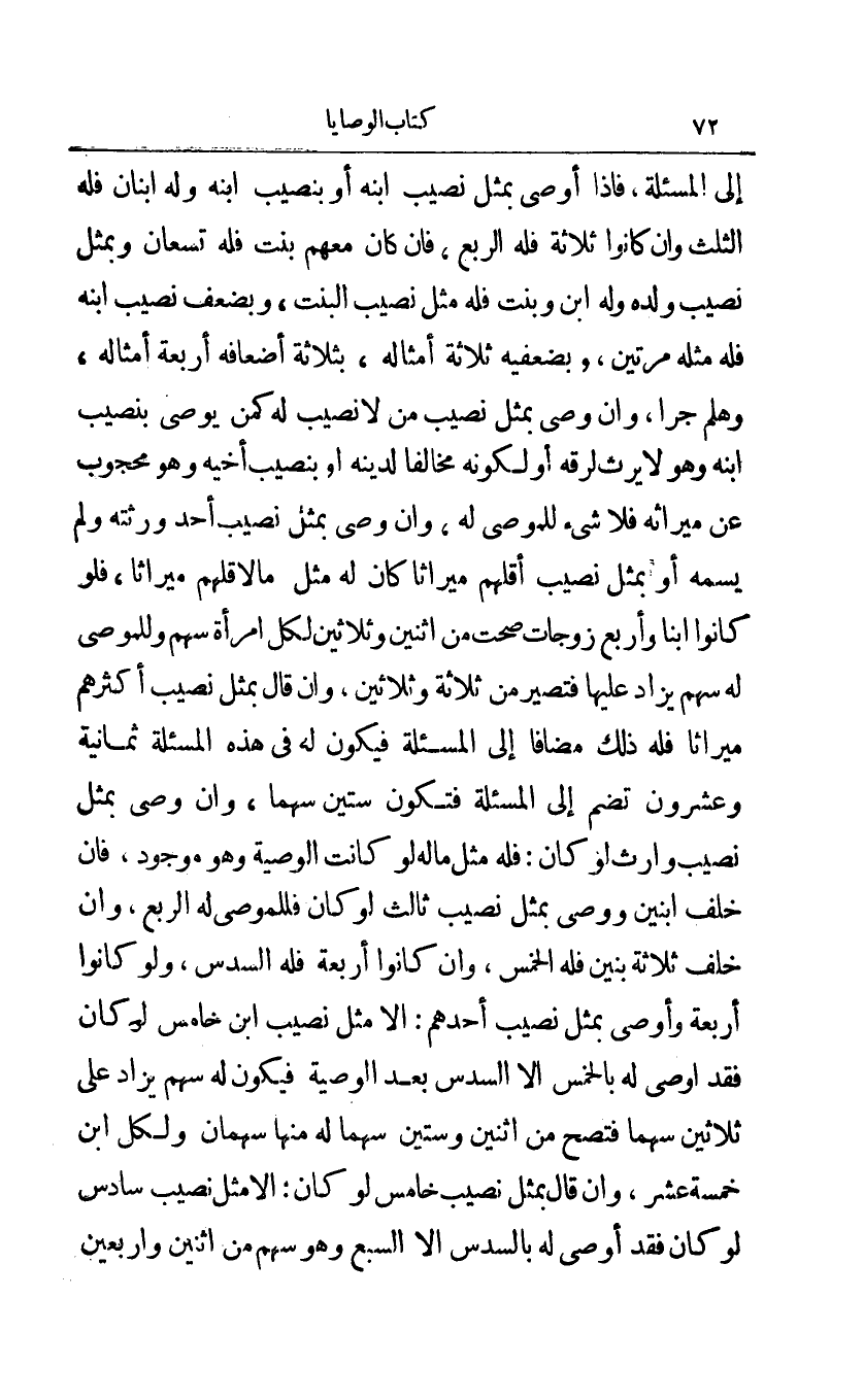 إلى المسألة فإذا أوصى بمثل نصيب ابنه أو بنصيب ابنه وله ابنان فله الثلث وأن كانوا ثلاثة فله الربع فأن كان معهم بنت فله تسعان وبمثل نصيب ولده وله ابن وبنت فله مثل نصيب البنت وبضعف نصيب ابنه فله مثله مرتين وبضعفيه ثلاثة أمثاله بثلاثة أضعافه أربعة أمثاله وهلم جرا وأن وصى بمثل نصيب من لا نصيب له كمن يوصى بنصيب ابنه وهو لا يرث لرقه أو لكونه مخالفا لدينه أو بنصيب أخيه وهو محجوب عن ميراثه فلا شيء للموصى له وأن وصى بمثل نصيب أحد ورثته ولم يسمه أو بمثل نصيب أقلهم ميراثا كان له مثل ما لأقلهم ميراثا فلو كانوا ابنا وأربع زوجات صحت من اثنين وثلاثين لكل امرأة سهم وللموصى له سهم يزاد عليها فتصير من ثلاثة وثلاثين وأن قال بمثل نصيب أكثرهم ميراثا فله ذلك مضافا إلى المسألة فيكون له في هذه المسألة ثمانية وعشرون تضم إلى المسألة فتكون ستين سهما وأن وصى بمثل نصيب وارث أو كان: فله مثل ماله لو كانت الوصية وهو موجود فأن خلف ابنين ووصى بمثل نصيب ثالث لو كان فللموصى له الربع وأن خلف ثلاثة بنين فله الخمس وأن كانوا أربعة فله السدس ولو كانوا أربعة وأوصى بمثل نصيب أحدهم: إلا مثل نصيب ابن خامس لو كان فقد أوصى له بالخمس إلا السدس بعد الوصية فيكون له سهم يزاد على ثلاثين سهما فتصح من اثنين وستين سهما له منها سهمان ولكل ابن خمسة عشر وأن قال بمثل نصيب خامس لو كان: إلا مثل نصيب سادس لو كان فقد أوصى له بالسدس إلا السبع وهو سهم من اثنين وأربعين