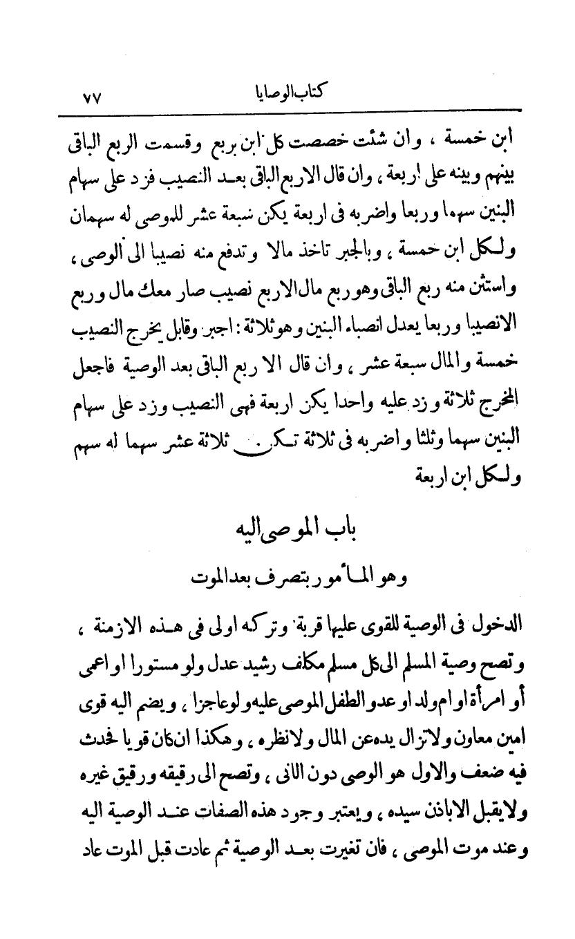 ابن خمسة وأن شئت خصصت كل ابن بربع وقسمت الربع الباقي بينهم وبينه على أربعة وأن قال إلا ربع الباقي بعد النصيب فزد على سهام البنين سهما وربعا وأضربه في أربعة يكن سبعة عشر للموصى له سهمان ولكل ابن خمسة وبالجبر تأخذ مالا وتدفع منه نصيبا إلى الوصي واستثن منه ربع الباقي وهو ربع مال إلا ربع نصيب صار معك مال وربع إلا نصيبا وربعا يعدل انصباء البنين وهو ثلاثة: أجبر وقابل يخرج النصيب خمسة والمال سبعة عشر وأن قال إلا ربع الباقي بعد الوصية فأجعل المخرج ثلاثة وزد عليه واحدا يكن أربعة فهي النصيب وزد على سهام البنين سهما وثلثا وأضربه في ثلاثة تكن ثلاثة عشر سهما له سهم ولكل ابن أربعة.