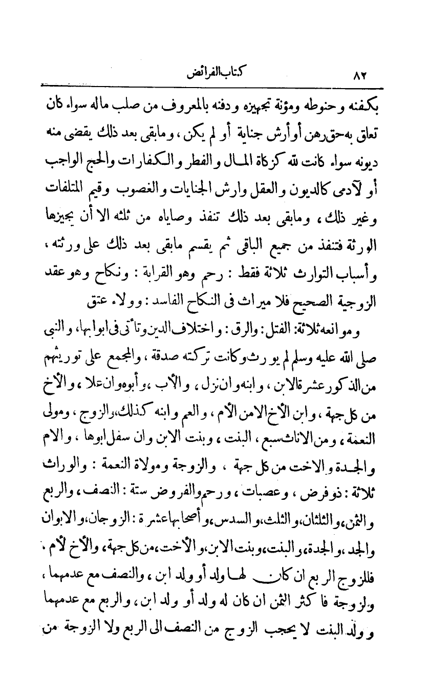 وموانعة ثلاثة: والرق: واختلاف الدين وتأتي في أبوابها والنبي صلى الله عليه وسلم لم يورث وكانت تركته صدقة والمجمع على توريثهم من الذكور عشرة الابن وابنه وأن نزل والأب وأبوه وأن علا والأخ من كل جهة وابن الأخ إلا من الأم والعم وابنه كذلك والزوج ومولى النعمة ومن الإناث سبع البنت وبنت الابن وان سفل أبوها والأم والجدة والأخت من كل جهة والزوجة ومولاة النعمة: والوارث ثلاثة: ذو فرض وعصبات ورحم والفروض ستة: النصف والربع والثمن والثلثان والثلث والسدس وأصحابها عشرة: الزوجان والأبوان والجد والجدة والبنت وبنت الابن والأخت ومن كل جهة والأخ لأم فللزوج الربع أن كان لها ولد أو ولد ابن والنصف مع عدمهما ولزوجه فأكثر الثمن أن كان له ولد أو ولد ابن والربع مع عدمها وولد البنت لا يحجب الزوج من النصف إلى الربع ولا الزوجة من