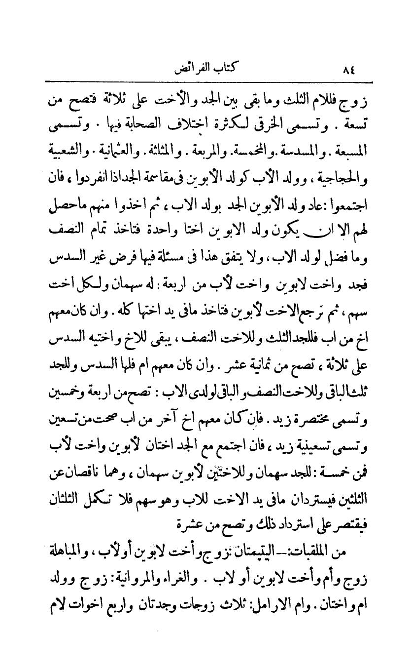 زوج فللأم الثلث وما بقي بين الجد والأخت على ثلاثة فتصح من تسعة وتسمى الخرقي لكثرة اختلاف الصحابة فيها وتسمى المسبعة والمسدسة والمخمسة والمربعة والمثلثة والعثمانية والشعبية والحجاجية وولد الأب كولد الأبوين في مقاسمة الجد إذا انفردوا فأن اجتمعوا: عاد ولد الأبوين الجد بولد الأب ثم أخذوا منهم ما حصل لهم إلا أن يكون ولد الأبوين أختا واحدة فتأخذ تمام النصف وما فضل لولد الأب ولا يتفق هذا في مسألة فيها فرض غير السدس فجد وأخت لأبوين وأخت لأب من أربعة: له سهمان ولكل أخت سهم ثم ترجع الأخت لأبوين فتأخذ ما في يد أختها كله وأن كان معهم أخ من أب فللجد الثلث وللأخت النصف يبقى للأخ وأختيه السدس على ثلاثة تصح من ثمانية عشر وأن كان معهم أم فلها السدس وللجد ثلث الباقي وللأخت النصف والباقي لولدي الأب: تصح من أربعة وخمسين وتسمى مختصرة زيد فأن كان معهم أخ آخر من أب صحت من تسعين وتسمى تسعينية زيد فأن اجتمع مع الجد أختان لأبوين وأخت لأب فمن خمسة: للجد سهمان وللأختين لأبوين سهمان وهما ناقصان عن الثلثين فيستردان ما في يد الأخت للأب وهو سهم فلا تكمل الثلثان فيقتصر على استرداد ذلك وتصح من عشرة.