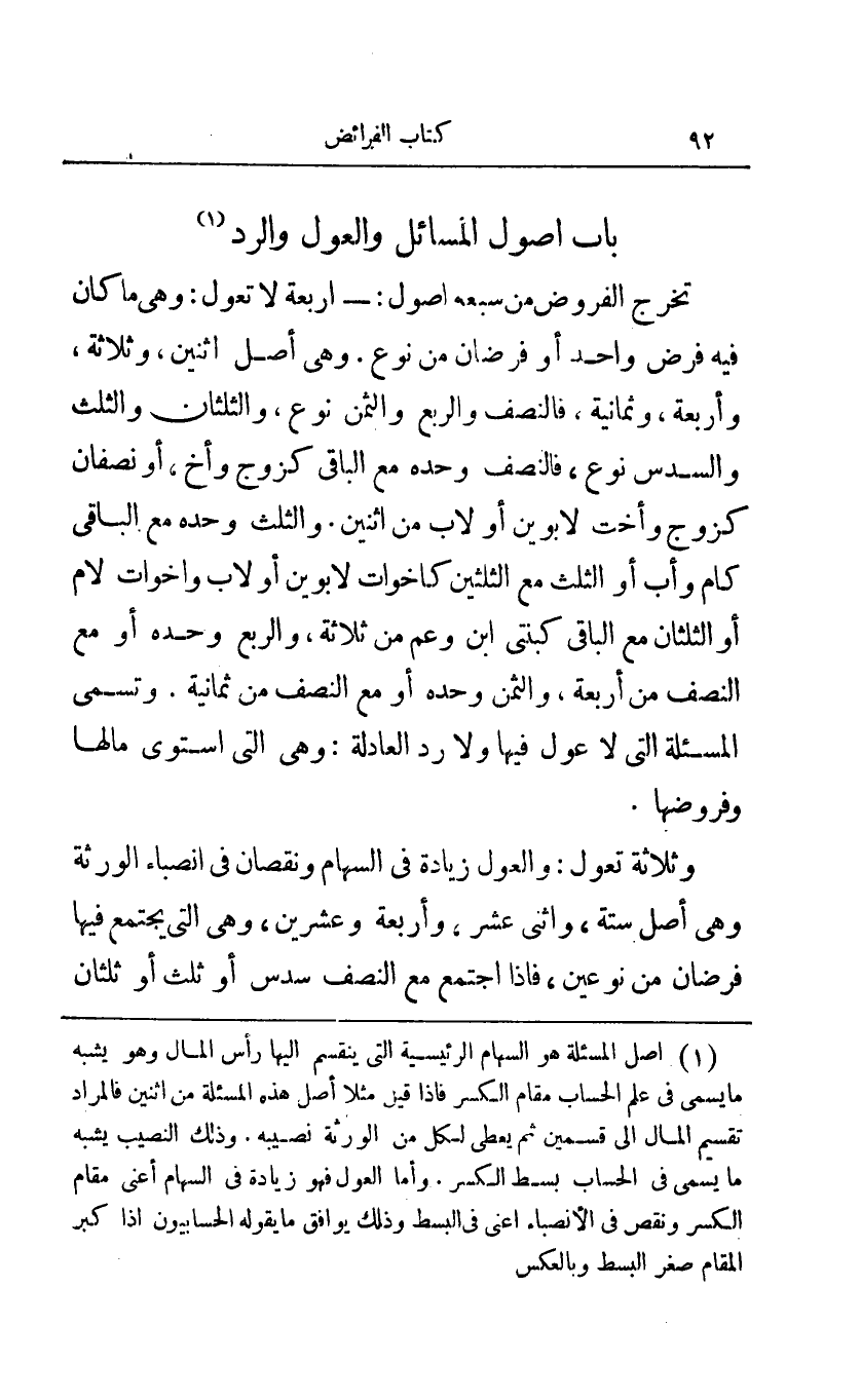 1 أصل المسئلة هو السهام الرئيسية التي ينقسم إليها رأس المال وهو يشبه ما يسمى في علم الحساب مقام الكسر فإذا قيل مثلا أصل هذه المسئلة من اثنين فالمراد تقسيم المال إلى قسمين ثم يعطى لكل من الورثة نصيبه.وذلك النصيب يشبه ما يسمى في الحساب بسط الكسر. وأما العول فهو زيادة في السهام أعني مقام الكسر ونقص في الأنصباء أعني في البسط وذلك يوافق ما يقوله الحسابيون إذا كبر المقام صغر البسط وبالعكس.