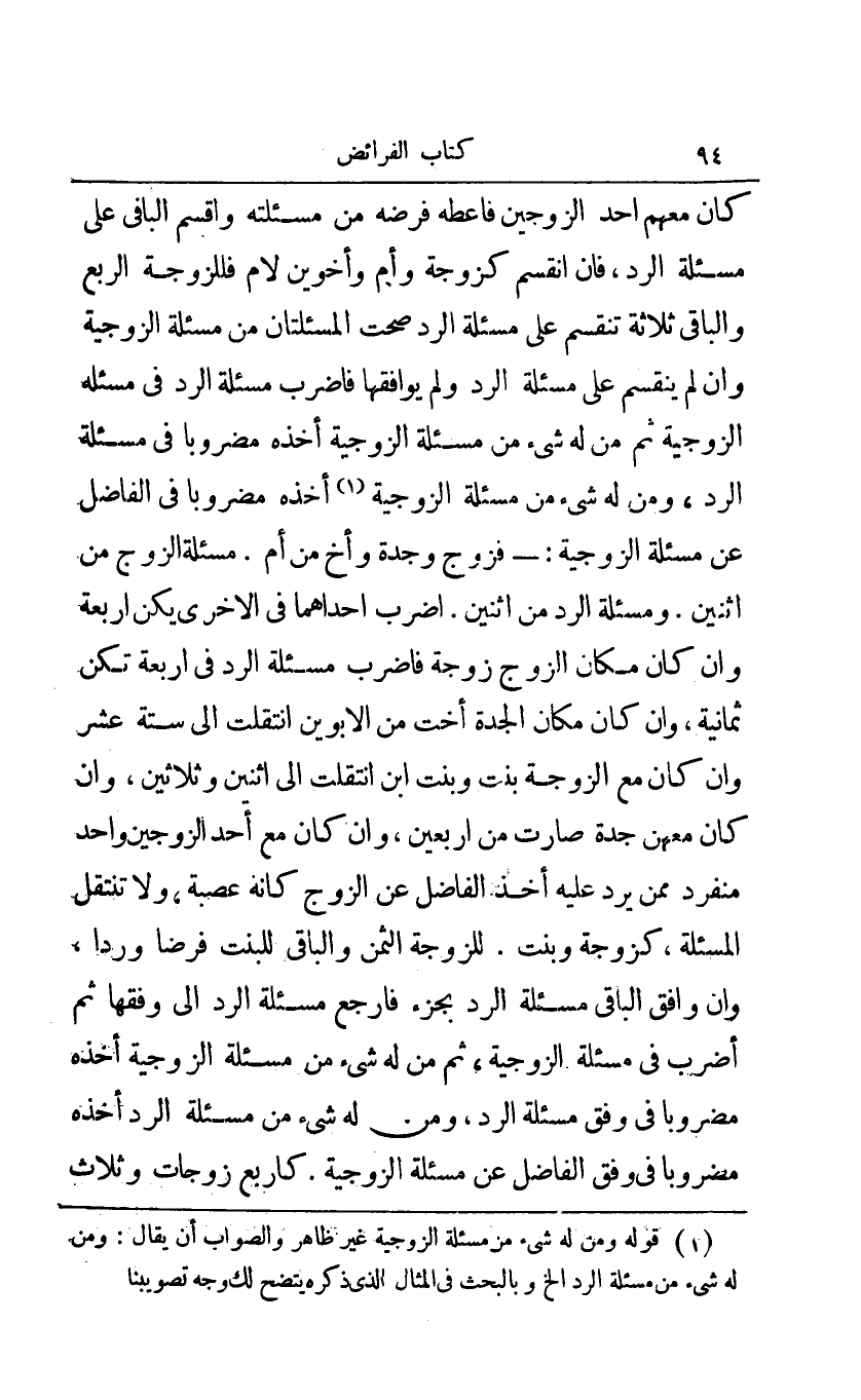 1 قوله ومن له شيء من مسئلة الزوجية غير ظاهر والصواب أن يقال: ومن له شيء من مسئلة الرد إلخ وبالبحث في المثال الذي ذكره يتضح لك وجه تصويبنا.