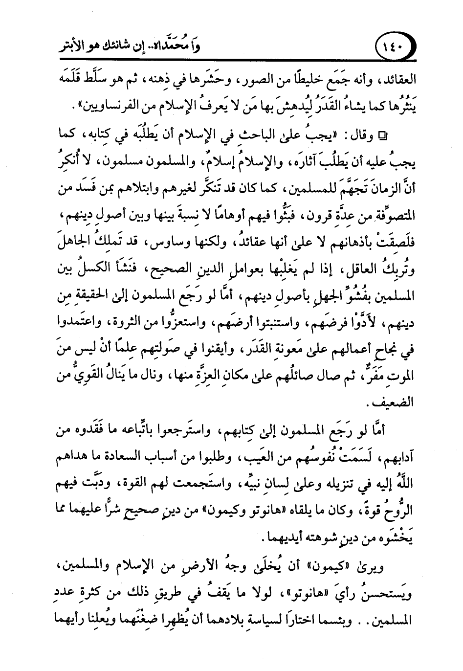 أما لو رَجَع المسلمون إلى كِتابهم، واستَرجعوا باتباعه ما فَقَدوه من آدابهم، لَسَمَتْ نُفوسُهم من العَيب، وطلبوا من أسباب السعادة ما هداهم اللهُ إليه في تنزيله وعلى لِسانِ نبيِّه، واستَجمعت لهم القوة، ودَبَّت فيهم الروحُ قوةً، وكان ما يلقاه "هانوتو وكيمون" من دينٍ صحيح شرًّا عليهما مما يَخْشوه من دين شوهته أيديهما.