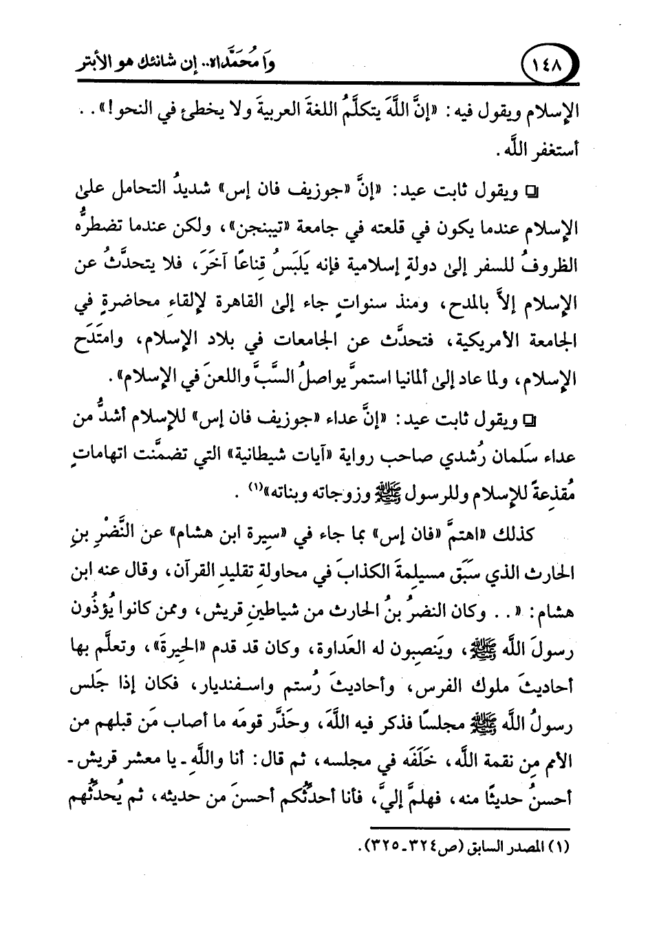 ° ويقول ثابت عيد: "إن عداء "جوزيف فان إس" للإسلام أشدُّ من عداء سَلمان رُشدي صاحب رواية "آيات شيطانية" التي تضمنت اتهاماتٍ مُقذِعةً للإسلام وللرسول - صلى الله عليه وسلم - وزوجاته وبناته" (¬1).