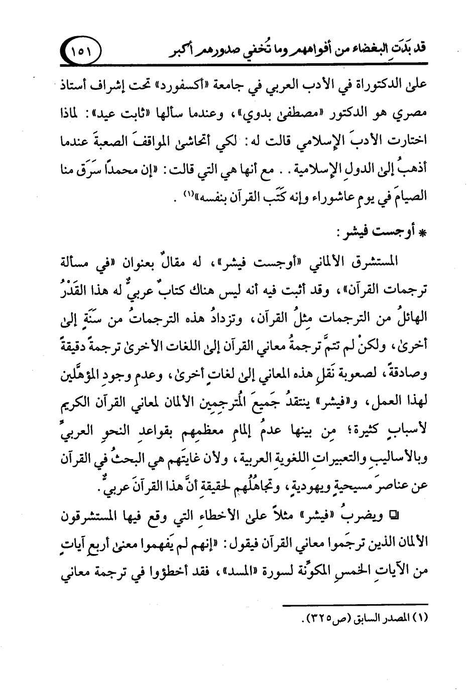 ° ويضربُ "فيشر" مثلاً على الأخطاءِ التي وقع فيها المستشرقون الألمان الذين ترجَموا معاني القرآن فيقول: "إنهم لم يَفهموا معنى أربع آياتٍ من الآياتِ الخمسِ المكوِّنة لسورة "المسد"، فقد أخطؤوا في ترجمة معاني