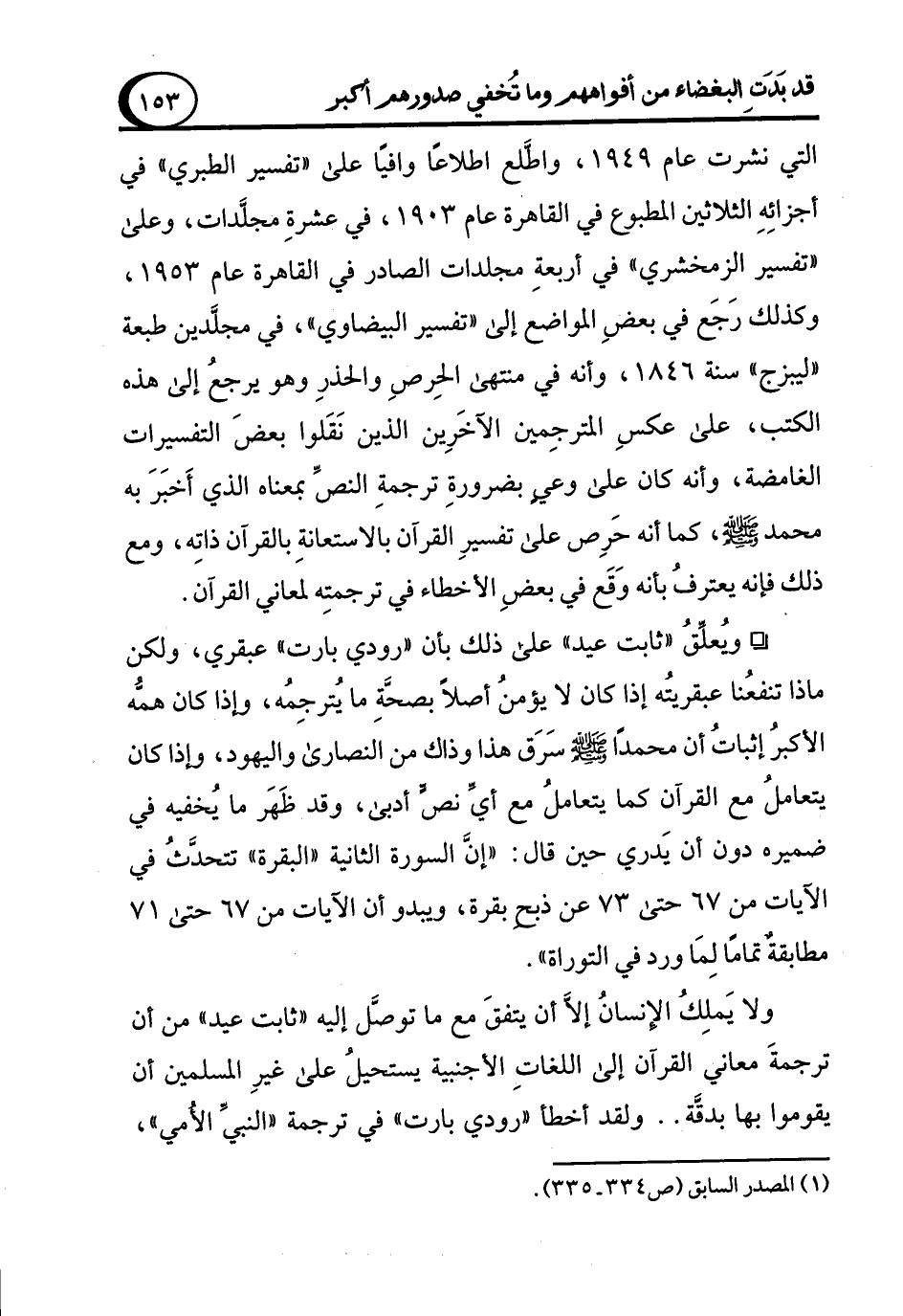 ° ويُعلِّق "ثابت عيد" على ذلك بأن "رودي بارت" عبقري، ولكن ماذا تنفعُنا عبقريته إذا كان لا يؤمنُ أصلاً بصحَّةِ ما يُترجِمُه، وإذا كان همُّه الأكبرُ إثبات أن محمدًا - صلى الله عليه وسلم - سَرَق هذا وذاك من النصاري واليهود، وإذا كان يتعاملُ مع القرآن كما يتعاملُ مع أيِّ نصٍّ أدبى، وقد ظَهَر ما يُخفيه في ضميره دون أن يَدري حين قال: "إن السورة الثانية "البقرة" تتحدَّثُ في الآيات من 67 حتى 73 عن ذبح بقرة، ويبدو أن الآيات من 67 حتى 71 مطابقة تمامًا لِمَا ورد في التوراة".