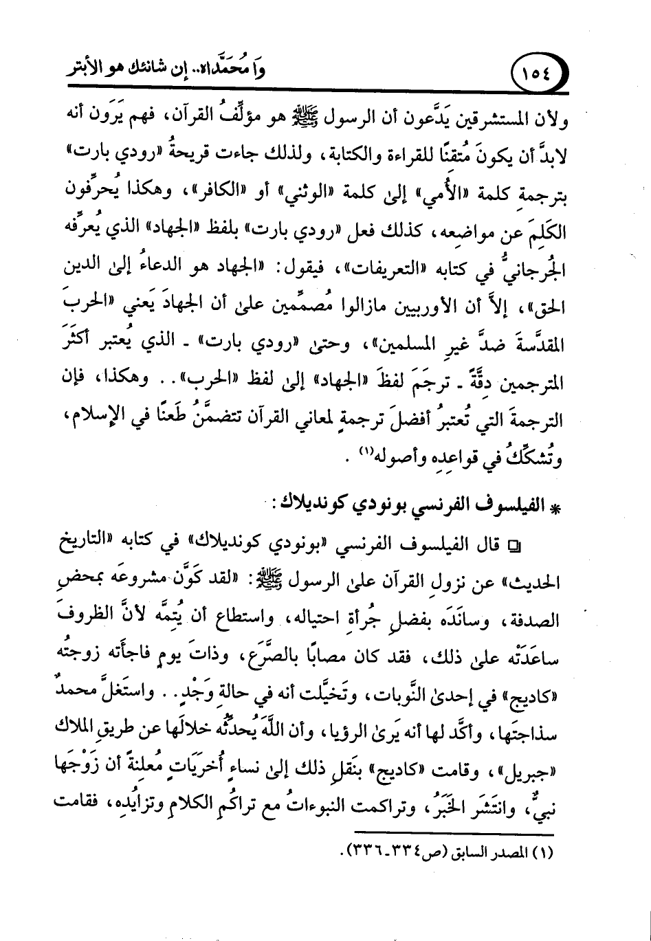 ° قال الفيلسوف الفرنسي "بونودي كونديلاك" في كتابه "التاريخ الحديث" عن نزولِ القرآن على الرسول - صلى الله عليه وسلم -: "لقد كَوَّن مشروعَه بمحض الصدفة، وسانَدَه بفضل جُرأةِ احتياله، واستطاع أن يُتِمَّه لأنَّ الظروفَ ساعَدَتْه على ذلك، فقد كان مصابًا بالصَّرَع، وذاتَ يوم فاجأَته زوجتُه "كاديج" في إحدى النَّوبات، وتَخيَّلت أنه في حالةِ وَجْدٍ .. واستَغلَّ محمدٌ سذاجتَها، وأكَّد لها أنه يَرى الرؤيا، وأن اللهَ يُحدثه خلالَها عن طريقِ الملاك "جيريل"، وقامت "كاديج" بنَقل ذلك إلى نساءٍ أُخرَيَاتٍ مُعلِنةً أن زوْجَها نبيٌّ، وانتَشَر الخَبَرُ، وتراكمت النبوءاتُ مع تراكُم الكلام وتزايُدِه، فقامت