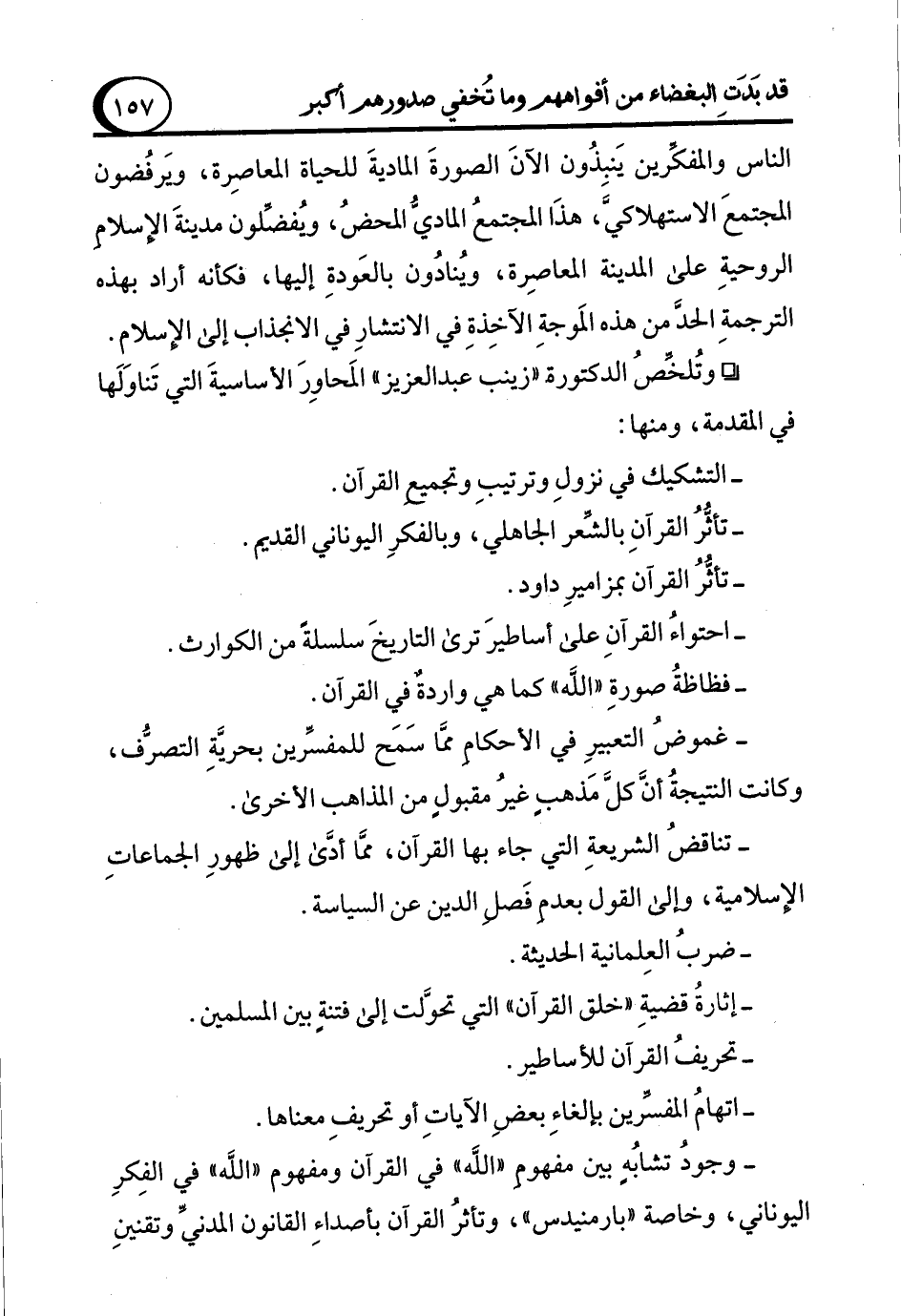 - تناقضُ الشريعةِ التي جاء بها القرآن، ممَا أدَّى إلى ظهورِ الجماعاتِ الإسلامية، وإلي القول بعدم فَصل الدين عن السياسة.
