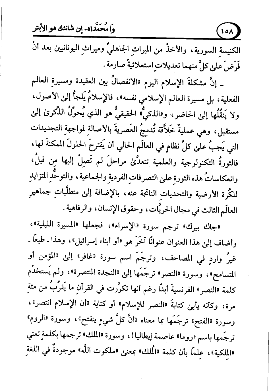 - إن مشكلةَ الإسلام اليوم "الانفصالُ بين العقيدة ومسيرةِ العالم الفعلية، بل مسيرة العالم الإسلامي نفسه"، فالإسلامُ يَلجأ إلى الأصول، ولا يَنقُلُها إلى الحاضر، و"الذكي" الحقيقي هو الذي يُحوِّلُ الذكرى إلى مستقبل، وهي عمليةٌ خَلافة تُدمجُ العَصريةَ بالأصالةِ لمواجهةِ التجديدات التي يَجبُ على كلِّ نظام في العالَم الحالي أن يَقترحَ الحلولَ الممكنةَ لها، فالثورةُ التكنولوجية والعلمية تتعدَّى مراحلَ لم تَصِلْ إليها مِن قبلُ، وانعكاساتُ هذه الثورةِ على التصرفاتِ الفرديةِ والجماعية، والتوحُّدِ المتزايدِ للكُرة الأرضية والتحدياتِ الناتجة عنه، بالإضافة إلى متطلَّباتِ جماهيرِ العالَم الثالث في مجال الحريَّات، وحقوق الإنسان، والرفاهية.
