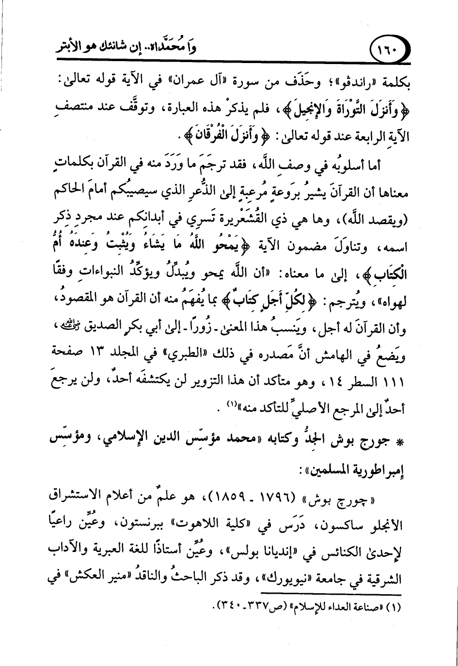 "جورج بوش" (1796 - 1859)، هو علم من أعلام الاستشراق الأنجلو ساكسون، درس في "كلية اللاهوت" ببرنستون، وعُيِّن راعيًا لإحدي الكنائس في "إنديانا بولس"، وعين أستاذًا للغة العبرية والآداب الشرقية في جامعة "نيويورك"، وقد ذكر الباحث والناقد "منير العكش" في