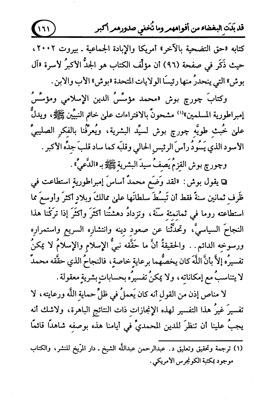 وكتابَ جورج بوش "محمد مؤسِّسُ الدين الإسلامي ومؤسِّسُ إمبراطورية المسلمين" (¬1) مشحونٌ بالافتراءات على خاتم النبيِّين - صلى الله عليه وسلم -، ويدلُّ على خُبثِ طويَّهِ جورج بوش لسيِّد البشرية، ويُعرِّفُنا بالفِكرِ الصليبيِّ الأسود الذي يَسُودُ رأسَ الرئيسِ الحالي وقلبَه كما ساد قلبَ جِدِّه الأكبر.