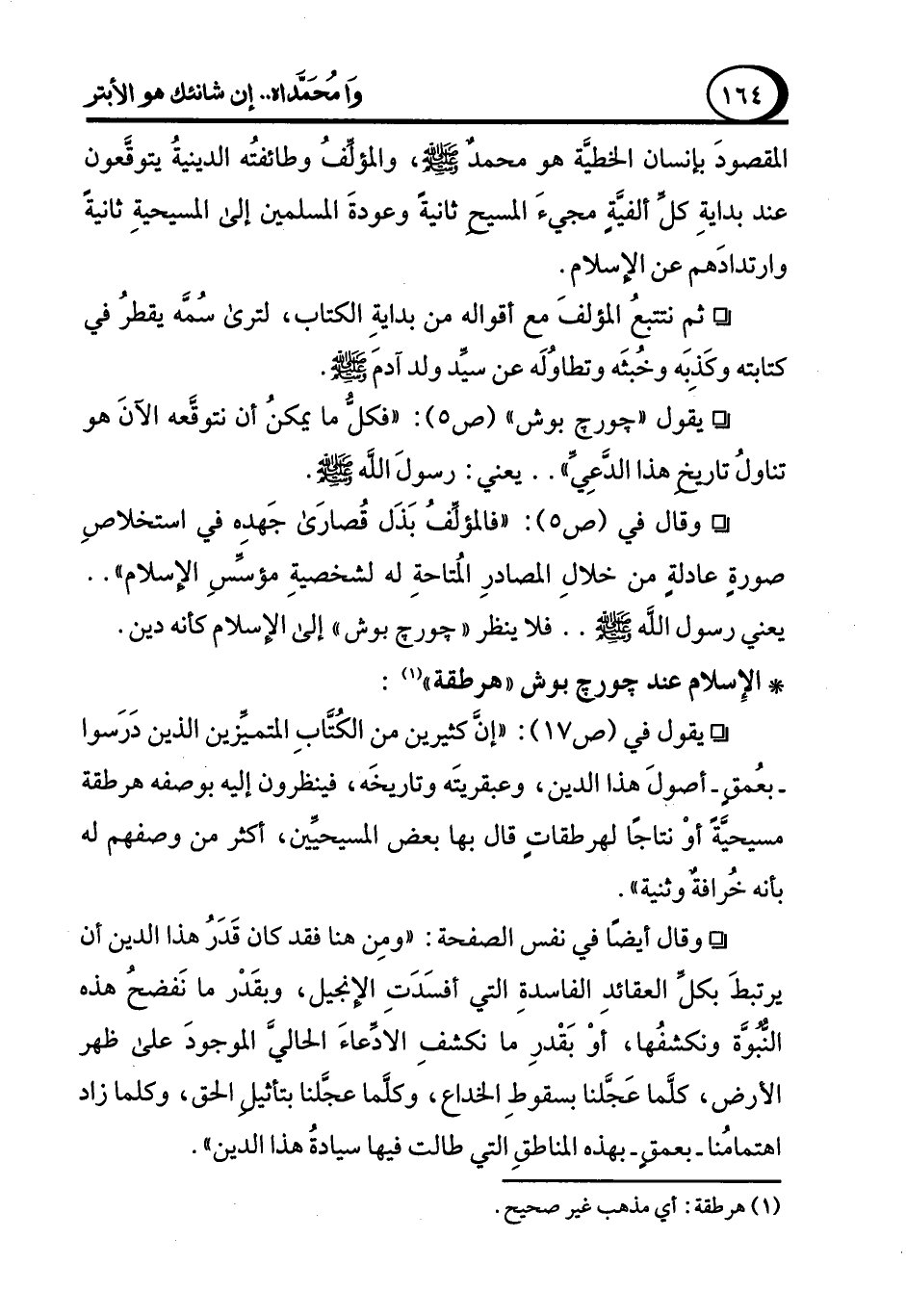 ° يقول "جورج بوش" (ص5): "فكلُّ ما يمكنُ أن نتوقَّعه الآنَ هو تناولُ تاريخ هذا الدَّعيِّ" .. يعني: رسولَ الله - صلى الله عليه وسلم -.