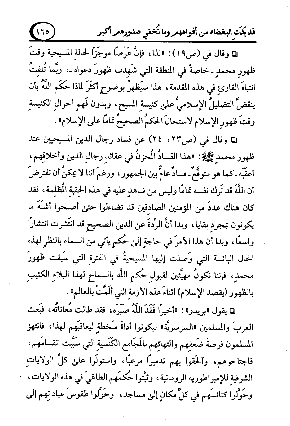 ° وقال في (ص 23، 24) عن فساد رجال الدين المسيحيين عند ظهور محمدٍ - صلى الله عليه وسلم -: "هذا الفسادُ المُحزنُ في عقائدِ رجالِ الدين وأخلاقِهم، أعقَبَه -كما هو متوقَّعٌ- فسادٌ عامٌّ بين الجمهور، ورغمَ أننا لا يمكنُ أن نفترضَ أن اللهَ قد تَرك نفسه تمامًا وليس من شاهدٍ عليه في هذه الحِقبةِ المُظلِمة، فقد كان هناك عددٌ من المؤمنين الصادِقين قد تضاءلوا حتى أصبحوا أشبَهَ ما يكونون بمجردِ بقايا، وبدا أنَّ الرِّدةَ عن الدين الصحيح قد انتَشرت انتشارًا واسعًا، وبدا أن هذا الأمرَ في حاجةٍ إلى حُكم يأتي من السماء بالنظرِ لهذه الحال البائسة التي وَصلت إليها المسيحيةُ في الفترةِ التي سَبقت ظهورَ محمدٍ، فإننا نكونُ مهيَّئين لقبولِ حُكمِ الله بالسماح لهذا البلاءِ الكئيبِ بالظهور (يقصد الإسلام) أثناءَ هذه الأزمةِ التي ألَمَّتْ بالعالم".