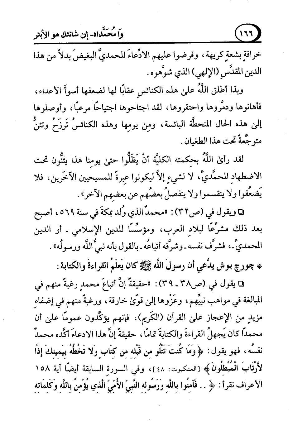° يقول في (ص 38 - 39): "حقيقةً إنَّ أتباعَ محمدِ رغبةً منهم في المبالغة في مواهب نبيِّهم، وعَزْوها إلى قوًى خارقة، ورغبةً منهم في إضفاءِ مزيدٍ من الإعجاز على القرآن (الكَريم)، فإنهم يؤكِّدون عمومًا على أن محمدًا كان يَجهلُ القراءةَ والكتابةَ تمامًا، حقيقةً إنَّ هذا الادعاءَ أكَّده محمدٌ نفْسُه، فهو يقول: {وَمَا كُنْتَ تَتْلُو مِنْ قَبْلِهِ مِنْ كِتَابٍ وَلَا تَخُطُّهُ بِيَمِينِكَ إِذًا لَارْتَابَ الْمُبْطِلُونَ} [العنكبوت: 48]، وفي السورةِ السابقة أيضًا آية 158 الأعراف نقرأ: { .. فَآمِنُوا بِاللَّهِ وَرَسُولِهِ النَّبِيِّ الْأُمِّيِّ الَّذِي يُؤْمِنُ بِاللَّهِ وَكَلِمَاتِهِ