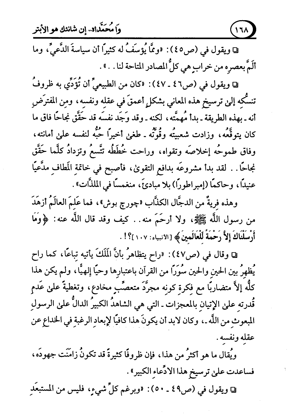 ° وقال في (ص 47): "راح يتظاهر بأنَّ المَلَكَ يأتيه تِباعًا، كما راح يُظهِرُ بين الحينِ والحين سُوَرًا من القرآن باعتبارِها وحيًا إِلهيًّا، ولم يكن هذا كلُّه إلاَّ متضاربًا مع فِكرةِ كونِه مجرَّد متعصِّبٍ مخادع، وتغطيةً على عَدمِ قُدرتهِ على الإتيانِ بالمعجزات -التي هي الشاهدُ الكبيرُ الدالُّ على الرسولِ المبعوثِ من الله-، وكان لابد أن يكونَ هذا كافيًا لإبعادِ الرغبةِ في الخداعِ عن عقلِه ونفسِه.