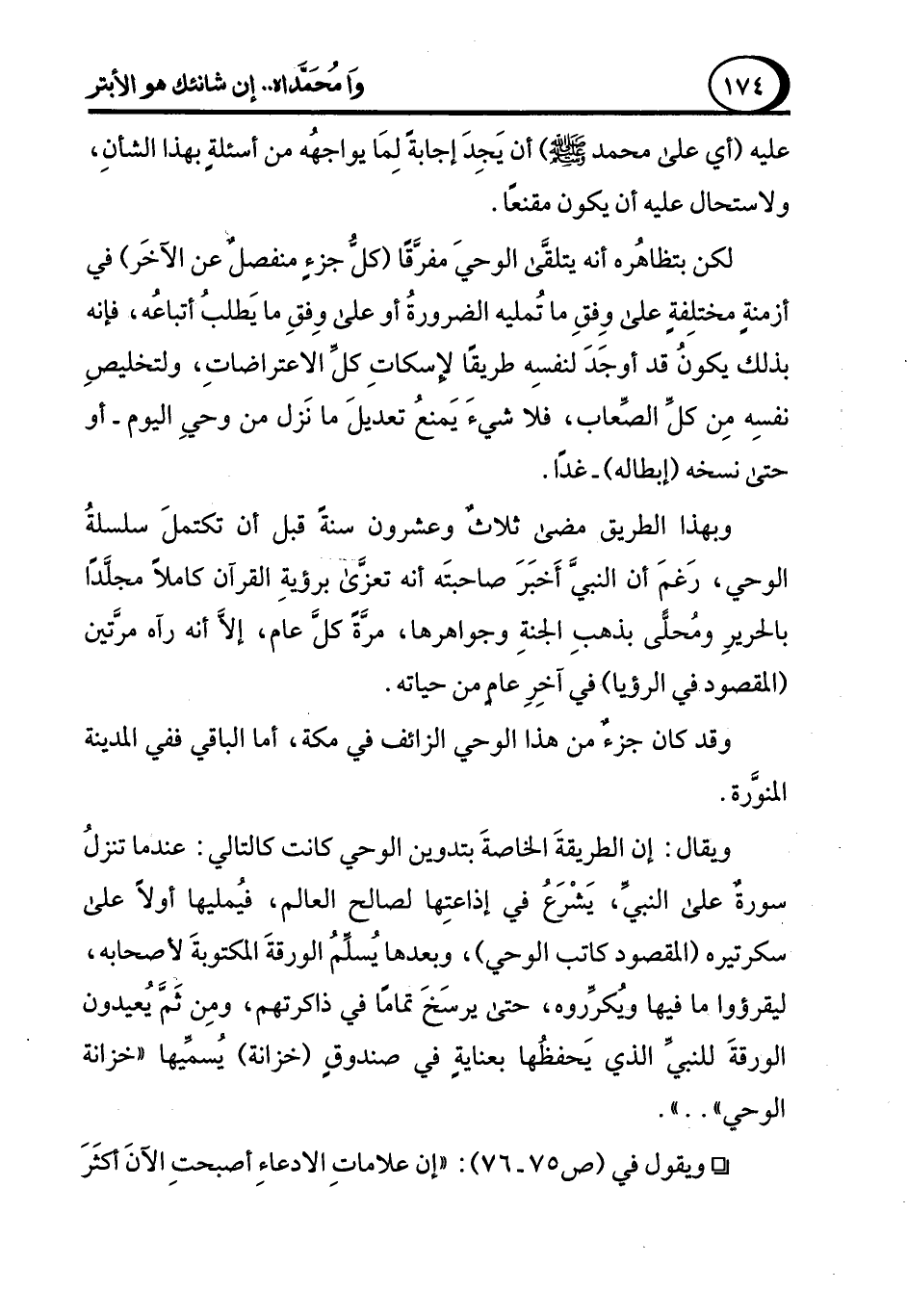 لكن بتظاهُره أنه يتلقَّى الوحيَ مفرَّقًا (كلُّ جزءٍ منفصلٌ عن الآخَر) في أزمنةٍ مختلِفةٍ على وِفقِ ما تُمليه الضرورةُ أو على وِفقِ ما يَطلبُ أتباعُه، فإنه بذلك يكونُ قد أوجَدَ لنفسِه طريقًا لإسكاتِ كلِّ الاعتراضاتِ، ولتخليصِ نفسِه مِن كلِّ الصِّعاب، فلا شيءَ يَمنعُ تعديلَ ما نَزل من وحيِ اليوم -أو حتى نسخه (إبطاله) - غدًا.
