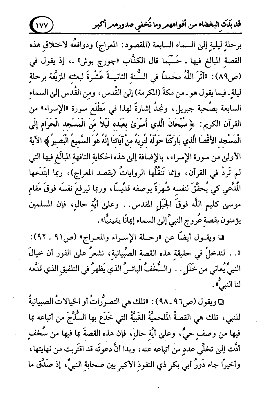 برحلةٍ ليليةٍ إلى السماء السابعة (المقصود: المعراج) ودوافعُه لاختلاقِ هذه القصةِ المبالغ فيها -حَسْبَما قال الكذَّاب "جورج بوش"-، إذ يقول في (ص 89): "آثَرَ اللهُ محمدًا في السَّنةِ الثانيةَ عَشْرةَ لبعثتِه المزيَّفة برحلةٍ ليلةٍ -فيما يقول هو- من مكةَ (المكرمة) إلى القُدس، ومِن القُدس إلى السماءِ السابعة بصُحبة جبريل، ونجدُ إشارةً لهذا في مَطْلَعِ سورة "الإسراء" من القرآن الكريم: {سُبْحَانَ الَّذِي أَسْرَى بِعَبْدِهِ لَيْلًا مِنَ الْمَسْجِدِ الْحَرَامِ إِلَى الْمَسْجِدِ الْأَقْصَى الَّذِي بَارَكْنَا حَوْلَهُ لِنُرِيَهُ مِنْ آيَاتِنَا إِنَّهُ هُوَ السَّمِيعُ الْبَصِيرُ} [الإسراء: 1] الآية الأولى من سورة الإسراء، بالإضافة إلى هذه الحكايةِ التافهةِ المبالَغ فيها التي لم تَردْ في القرآن، وإنما تَنقُلُها الرواياتُ (يقصد المعراجِ)، ربما ابتَدَعها المُدَّعي كي يُحقِّقَ لنفسِه شُهرةً بوصفه قدِّيسًا، وربما ليرفع نفسَه فوقَ مَقامِ موسى كليم الله فوقَ الجَبَلِ المقدس .. وعلى أيَّةِ حالٍ، فإن المسلمين يؤمنون بقصةِ عُروج النبيِّ إلى السماء إيمانًا يقينيًّا".
